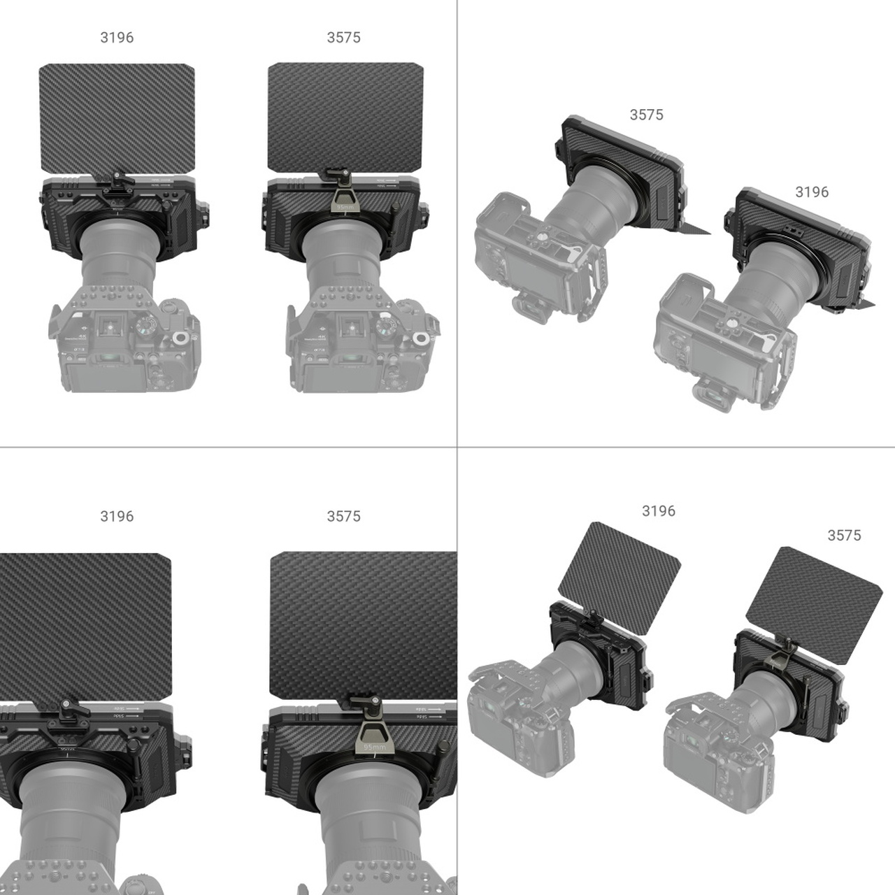 El SmallRig Mini Matte Box Lite 3575 está diseñado para cámaras réflex digitales y sin espejo, con el fin de evitar que la luz solar u otras fuentes de luz provoquen reflejos. Su conector de pinza es compatible con anillos adaptadores de distintos tamaños (Φ52-95 mm; Φ55-95 mm; Φ58-95 mm; Φ62-95 mm; Φ67-95 mm; Φ72-95 mm; Φ77-95 mm; Φ82-95 mm; Φ86-95 mm) o se acopla directamente al objetivo de Φ95 mm; su anillo adaptador es compatible con filtros CPL, ND y otros filtros circulares de hasta Φ92,5 mm. Con el portafiltros (ID: 3319/3320) se pueden instalar rápidamente filtros encajables de 4 x 5,65"/4 x 4" con un grosor de 4 mm