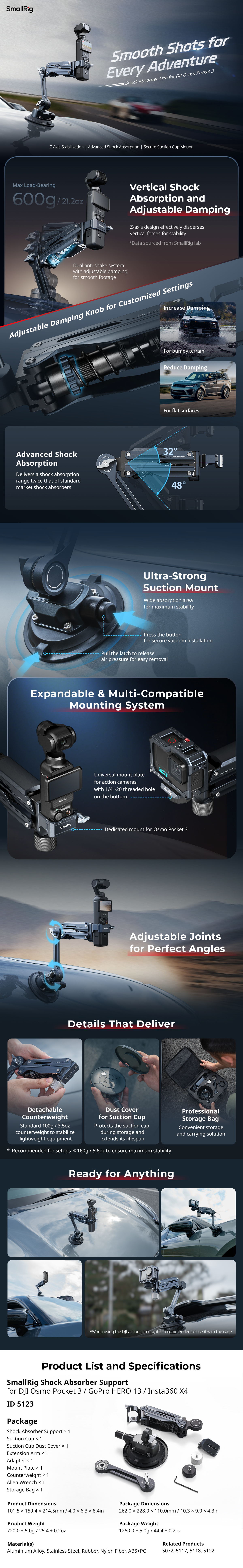 El SmallRig mini Shock Absorber Arm para DJI Osmo Pocket 3 / GoPro HERO13 / Insta360 X4 5123 está especialmente diseñado para grabar desde un vehículo con la cámara DJI Osmo Pocket 3 y, al mismo tiempo, incluye un adaptador para conectar cámaras de acción como la GoPro HERO13 Black y la Insta360 X4. El brazo con amortiguador está equipado con un resorte de alta resistencia y un sistema de amortiguación hidráulico que reduce significativamente las vibraciones verticales al grabar desde un vehículo y garantiza tomas estables.