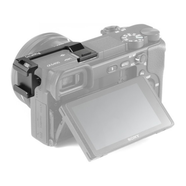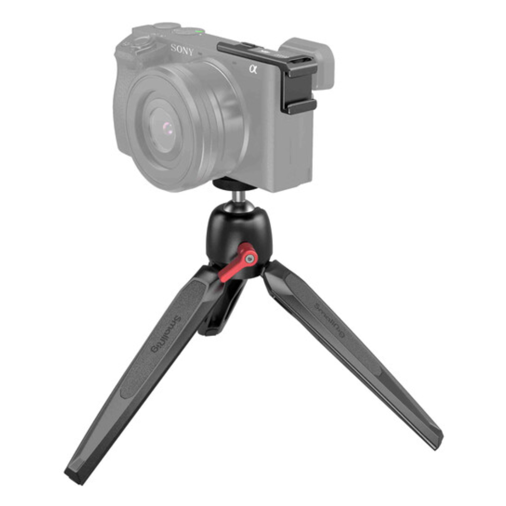 Complementa tu cámara Sony a6000, a6100, a6300, a6400 o a6500 y añádele accesorios con este kit de minitrípode y adaptador para zapata de la marca SmallRig. El kit incluye un minitrípode de mesa de aluminio y un accesorio para la zapata en el lado izquierdo.
