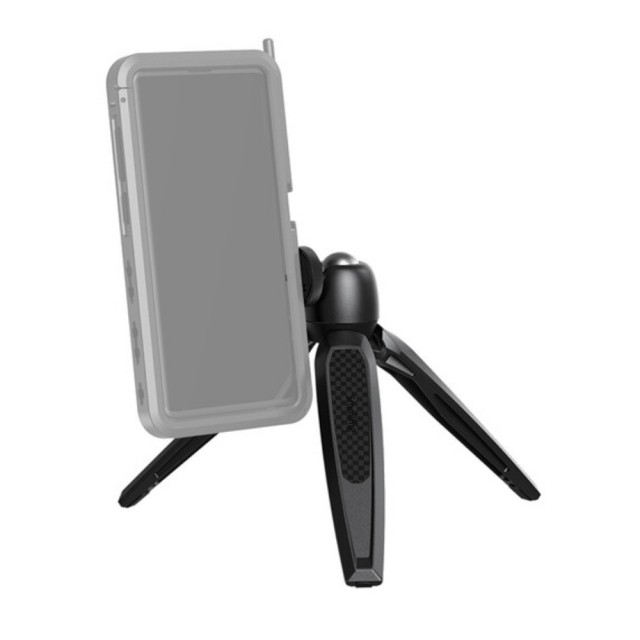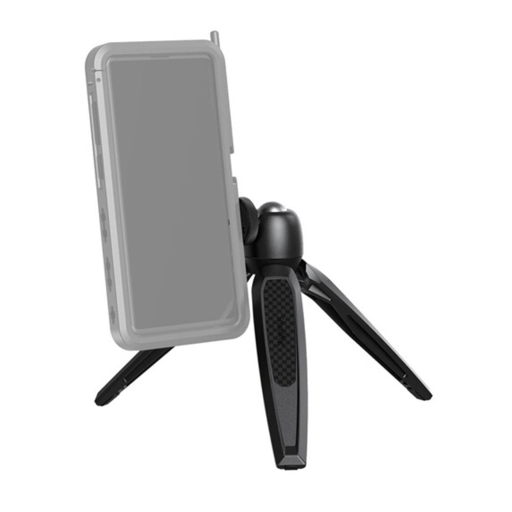 El minitrípode cuenta con un tornillo de montaje de 1/4"-20 para la cámara, una altura de trabajo de 15 cm, una capacidad de carga de 10 kg y está equipado con una rótula ajustable que se inclina hacia delante en un rango de -40 a 40°, hacia los lados en un rango de -90 a 40° y gira 360°. El accesorio incluido para conectar complementos se fija a la cámara mediante un adaptador y amplía la ranura hacia el lado izquierdo de la cámara, de modo que los complementos no obstaculizan la pantalla abatible de la cámara.