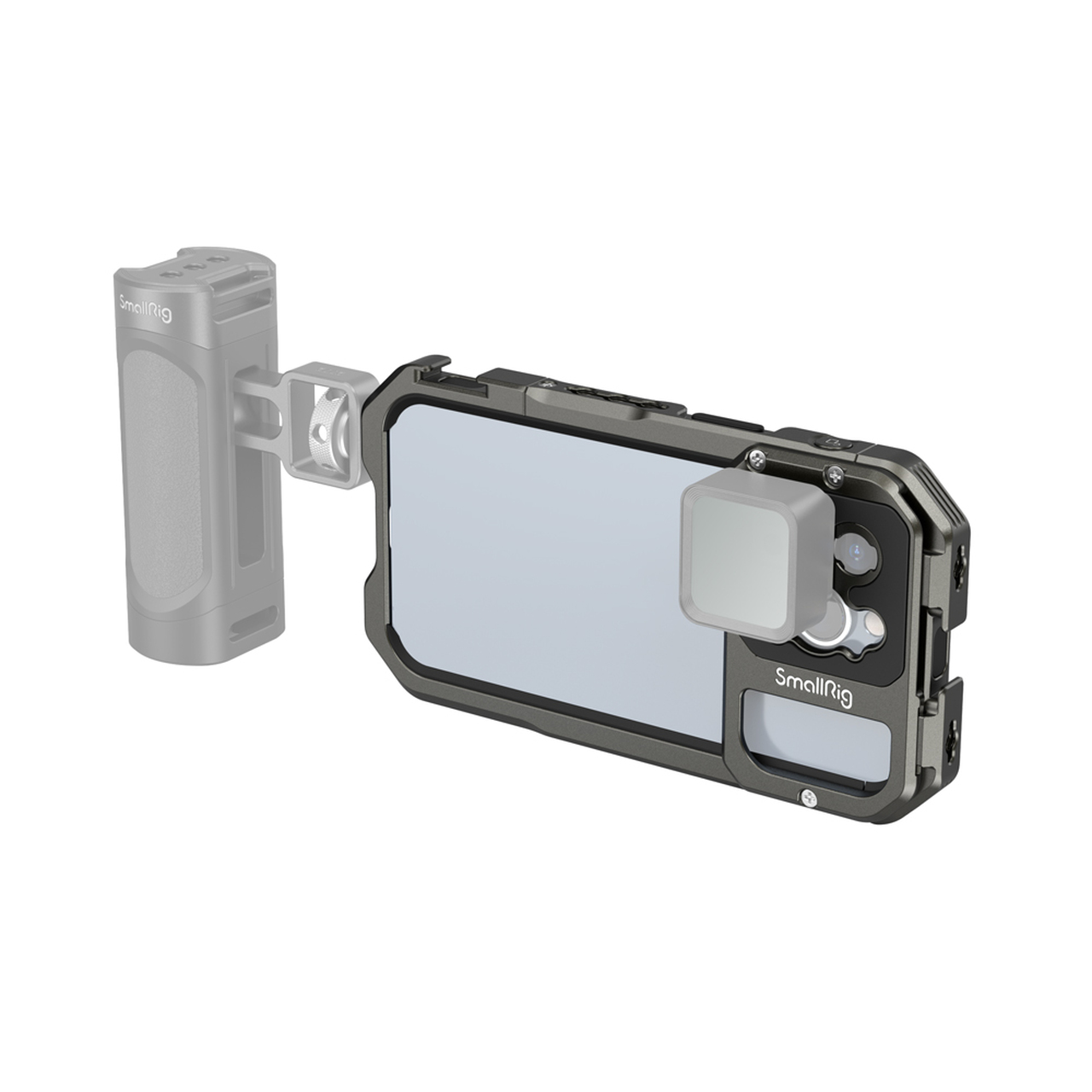 La jaula de vídeo SmallRig Mobile Video Cage 3562 es una jaula multifuncional especializada diseñada para el iPhone 13 Pro, ideal para videografía profesional, retransmisiones en directo y vlogs. Es compacta, pesa solo 87 g y cuenta con orificios roscados de 1/4"-20 a prueba de torsión. Es compatible con accesorios como la empuñadura lateral 2772, el trípode BUT2664, el micrófono 3452 y la luz LED 3286. Su tapa trasera de la lente es intercambiable y compatible con lentes con rosca M o de 17 mm para una mejor calidad de imagen. El diseño no bloquea los botones ni los puertos del iPhone y permite el uso de radares, objetivos ultra gran angulares y la carga inalámbrica. Gracias a su diseño con cierre rápido, la jaula se monta y desmonta más fácilmente, es más segura y estable, y una vez bloqueada no se desliza ni siquiera con un toque accidental. La carcasa metálica maciza, junto con las almohadillas integradas, protege el smartphone y evita las vibraciones y los arañazos. La jaula permite tomar fotos tanto en horizontal como en vertical.