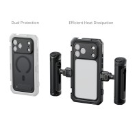 El teléfono se puede fijar a la jaula incluso con la funda protectora puesta. La funda protectora blanda cuenta con varios orificios roscados de 1/4"-20 con protección antitorsión y soportes para pies de trípode, que se pueden ampliar con accesorios como empuñaduras, trípodes, micrófonos y luces. La interfaz simplificada de liberación rápida permite un ajuste eficaz tanto a mano como en trípode.