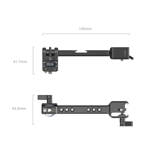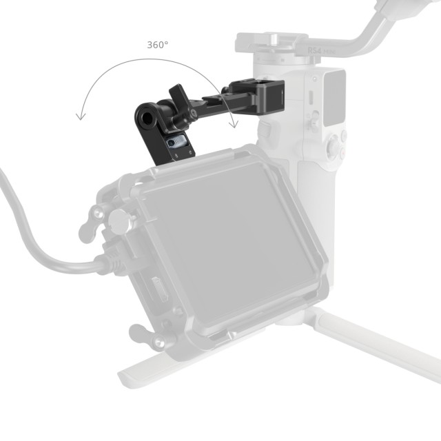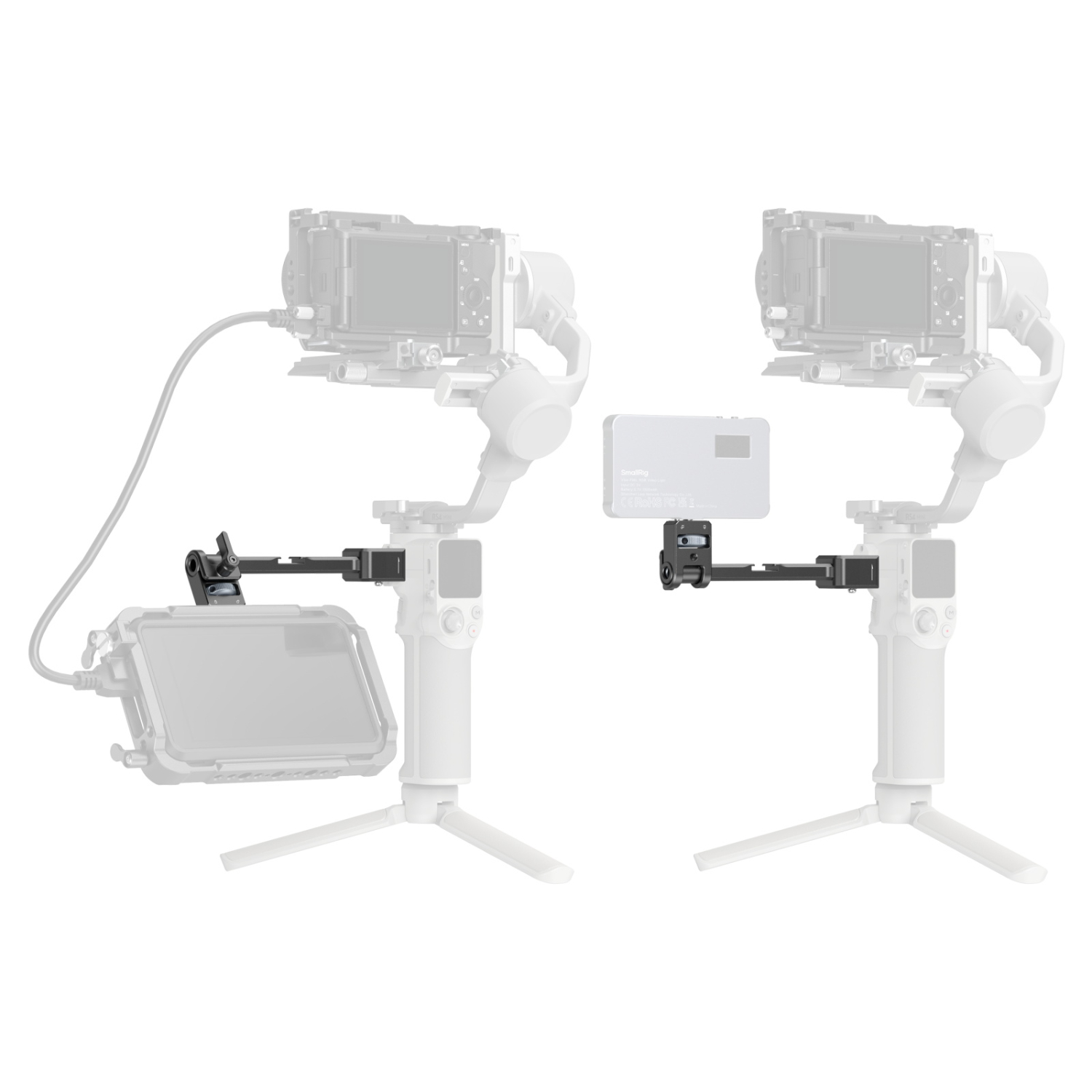 El soporte para monitor SmallRig para la serie RS de DJI 5337 está diseñado para montar monitores y accesorios fotográficos en el lateral de los estabilizadores. Este soporte está equipado con una abrazadera NATO y es compatible con los estabilizadores de la serie RS de DJI equipados con un riel NATO. Con una capacidad de carga de hasta 1,5 kg, es adecuado para monitores de aproximadamente 5 pulgadas y permite un giro suave de 360° con un botón de bloqueo seguro. Además, el soporte incluye seis orificios con rosca de 1/4"-20 y una zapata para fijar micrófonos, brazos mágicos y otros accesorios. También se incluye una barra NATO especial que protege los puertos del dispositivo contra el desgaste.