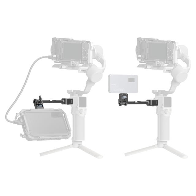 El soporte para monitor SmallRig para la serie RS 5337 de DJI está diseñado para montar monitores y accesorios fotográficos en el lateral de los estabilizadores. Este soporte está equipado con una abrazadera NATO y es compatible con los estabilizadores de la serie RS de DJI equipados con una barra NATO. Con una capacidad de carga de hasta 1,5 kg, es adecuado para monitores de aproximadamente 5 pulgadas y permite un giro fluido de 360° con un botón de bloqueo seguro. Además, el soporte incluye seis orificios con rosca de 1/4"-20 y una zapata para fijar micrófonos, brazos mágicos y otros accesorios. También se incluye una barra NATO especial que protege los puertos del dispositivo contra el desgaste.