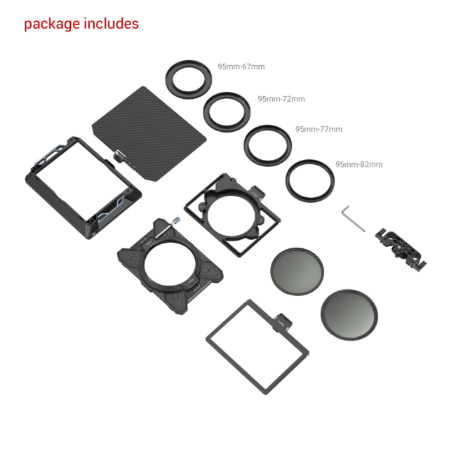 El kit SmallRig Multifuncional Modular Matte Box (Φ95 mm) VND 3645, como uno de los matte boxes de la serie Star-Trail, está diseñado para cámaras sin espejo con el fin de evitar que la luz solar u otras fuentes de luz provoquen destellos y reflejos, y para controlar la imagen en la pantalla. Para una profundidad de campo determinada, ayuda a equilibrar la exposición modificando el flujo de luz exterior. El kit se suministra de serie con cuatro adaptadores roscados (Φ67-95 mm / Φ72-95 mm / Φ77-95 mm / Φ82-95 mm) para filtros circulares, como VND, GND, CPL, objetivos comunes para cámaras réflex digitales y objetivos de cine de Φ95 mm, o bien puede adquirir por separado un juego de anillos adaptadores (Φ52-95 mm / Φ55-95 mm / Φ58-95 mm / Φ62-95 mm / Φ86-95 mm) 3383 para una mayor compatibilidad.