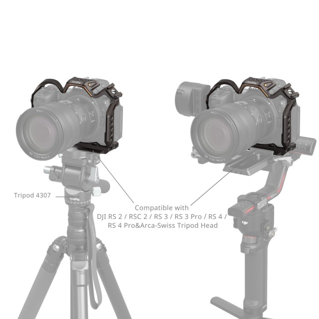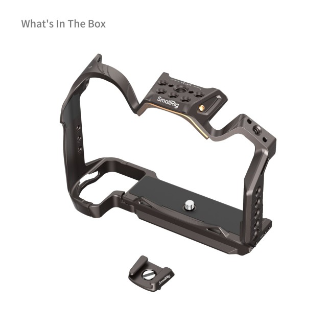 Jaula SmallRig «Night Eagle» para Nikon Z 6III 4521, que proporciona una carcasa protectora y opciones versátiles de ampliación de la cámara. La jaula se caracteriza por un diseño moderno con curvas elegantes, sutiles detalles dorados y un nuevo acabado en color marrón bronce. Utiliza un sistema de fijación de tres puntos que sujeta la cámara Nikon Z 6III mediante un tornillo inferior de 1/4"-20 y dos tornillos M2,5 a ambos lados, mientras que las almohadillas de silicona integradas evitan que se raye la cámara. Ofrece libre acceso a los botones, ranuras para tarjetas, pantallas abatibles y compartimentos para baterías. El soporte extraíble para zapata fría está equipado con pasadores de posicionamiento antideslizamiento en la parte inferior. Se puede fijar a los laterales y a la parte superior de la jaula, lo que permite una ampliación versátil con micrófonos, luces y otros accesorios. La jaula está equipada con diversas interfaces de expansión, como orificios roscados de 1/4"-20, orificios roscados de 3/8"-16 y orificios de posicionamiento ARRI, compatibles con soportes laterales (ID 2093, 4015), soportes superiores (ID 3765), soportes para monitores (ID 2903, 2904), trípodes (ID 3989, 4465), soportes para baterías externas (ID 2336) y placas miniatura para baterías V-mount (ID 2987). Los orificios de fijación integrados de 1/4"-20 en los laterales permiten acoplar accesorios como la abrazadera para una sola barra (ID 3598), el brazo mágico (ID 3873) y el asa lateral (ID 4346). En el lado izquierdo hay una guía NATO integrada para la fijación y desmontaje rápido de las empuñaduras laterales (ID 3847, 4017). La jaula también cuenta con orificios integrados para correas de muñeca (ID 3848, 2456), así como con una interfaz QD integrada compatible con la correa de hombro (ID 4118). La placa de fijación rápida Arca-Swiss en la parte inferior es compatible con trípodes de tipo Arca y gimbals DJI RS 2 / RSC 2 / RS 3 / RS 3 Pro / RS 4 / RS 4 Pro, lo que permite cambiar fácilmente entre gimbals, configuraciones de mano y trípodes. Además, la llave plana de dos cabezales situada en la base simplifica el montaje y desmontaje.