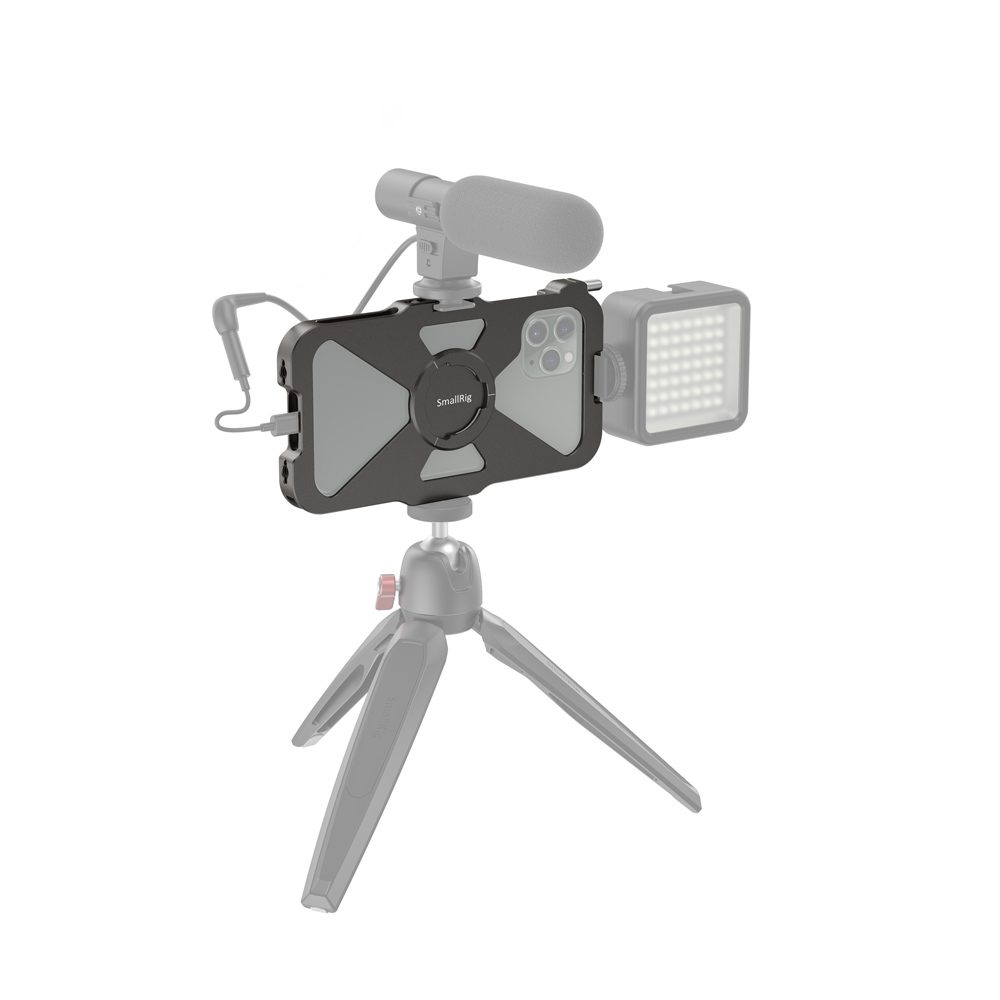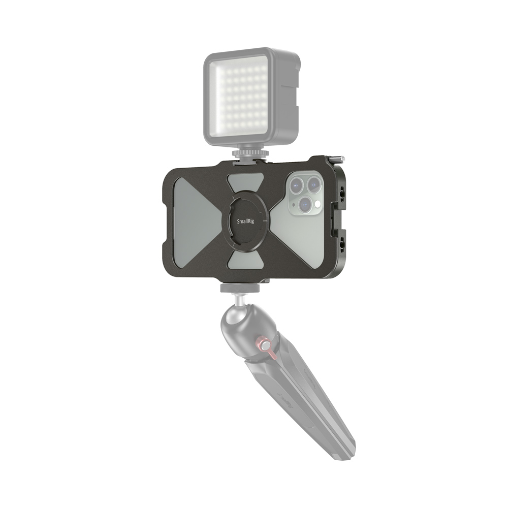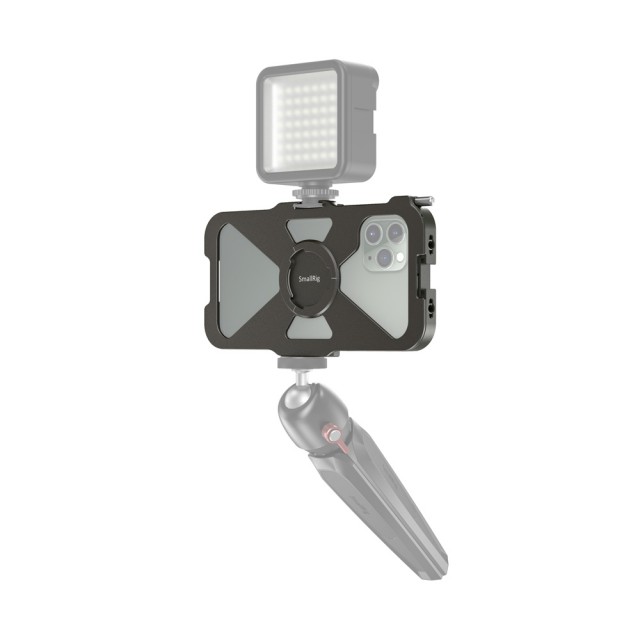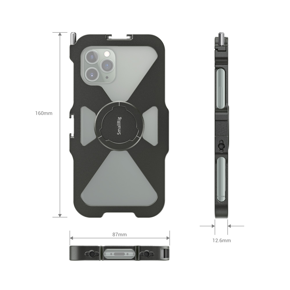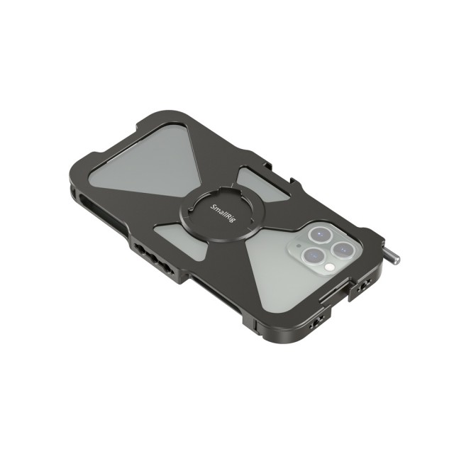La jaula SmallRig Pro Mobile Cage para iPhone 11 Pro CPA2471 está diseñada para proteger tu iPhone 11 Pro y permitir la conexión de accesorios adicionales para la fotografía y la grabación de vídeo con el móvil, retransmisiones en directo, entrevistas, vlogs, etc. En un lado cuenta con un tornillo que garantiza un montaje y desmontaje rápido del teléfono. Está equipada con dos zapatas y varios orificios roscados de 1/4"-20 para montar diversos accesorios, como micrófonos, luces LED, trípodes, etc., y admite la captura tanto horizontal como vertical. Es compatible con el asa lateral de aluminio HSS2424 para la jaula del smartphone, que permite grabar con la mano, y con la abrazadera para cable de teléfono móvil BSC2390, que sujeta el cable durante la grabación. Las almohadillas de goma integradas ayudan a amortiguar los golpes y evitan que el teléfono se raye. La estructura hueca, diseñada para reducir el peso y facilitar la refrigeración del teléfono móvil, evita los botones laterales y las interfaces, así como la zona de la antena, para prevenir el riesgo de interferencias en la señal.