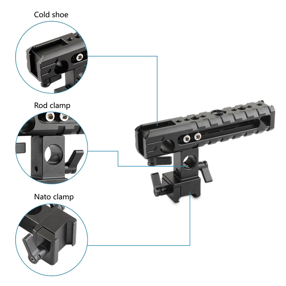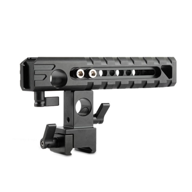 Soporte integrado para zapata en la parte superior para fijar luces a la cámara, soportes antivibración para micrófonos, etc. Otro soporte integrado para zapata en el extremo del mango para fijar un soporte EVF, etc. El mango se suministra con un patrón de orificios para pasadores para fijar accesorios ARRI. Orificios de 1/4''-20 y 3/8''-16 en la empuñadura para fijar otros accesorios. Además, el acabado con ranuras profundas y una serie de puntos de montaje te ofrece un agarre cómodo. La empuñadura es ideal para grabar en modo bajo y transportar fácilmente la cámara.
