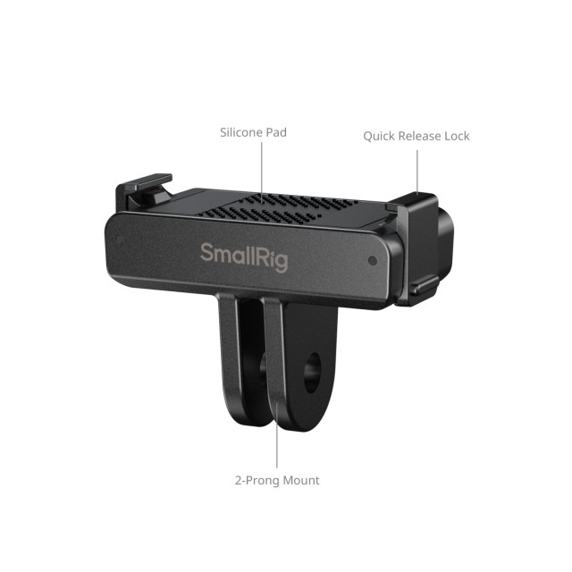 La base está equipada con un soporte de 2 pines que garantiza la compatibilidad con diversos accesorios de SmallRig, incluidos soportes con ventosa (ID 4235), pinzas de sujeción (ID 4102B), palos selfies (ID 5403) y soportes para el cuello (ID 5126).