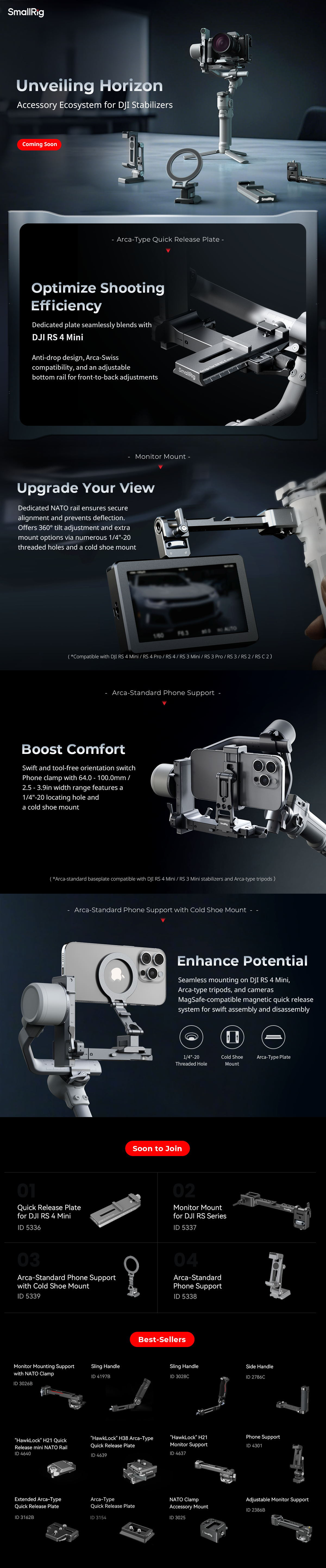 1. Adaptado para el RS 4 Mini: Totalmente compatible con la placa de montaje Arca-Swiss original, la jaula para la cámara y las placas en L, lo que garantiza una integración perfecta con el estabilizador RS 4 Mini.