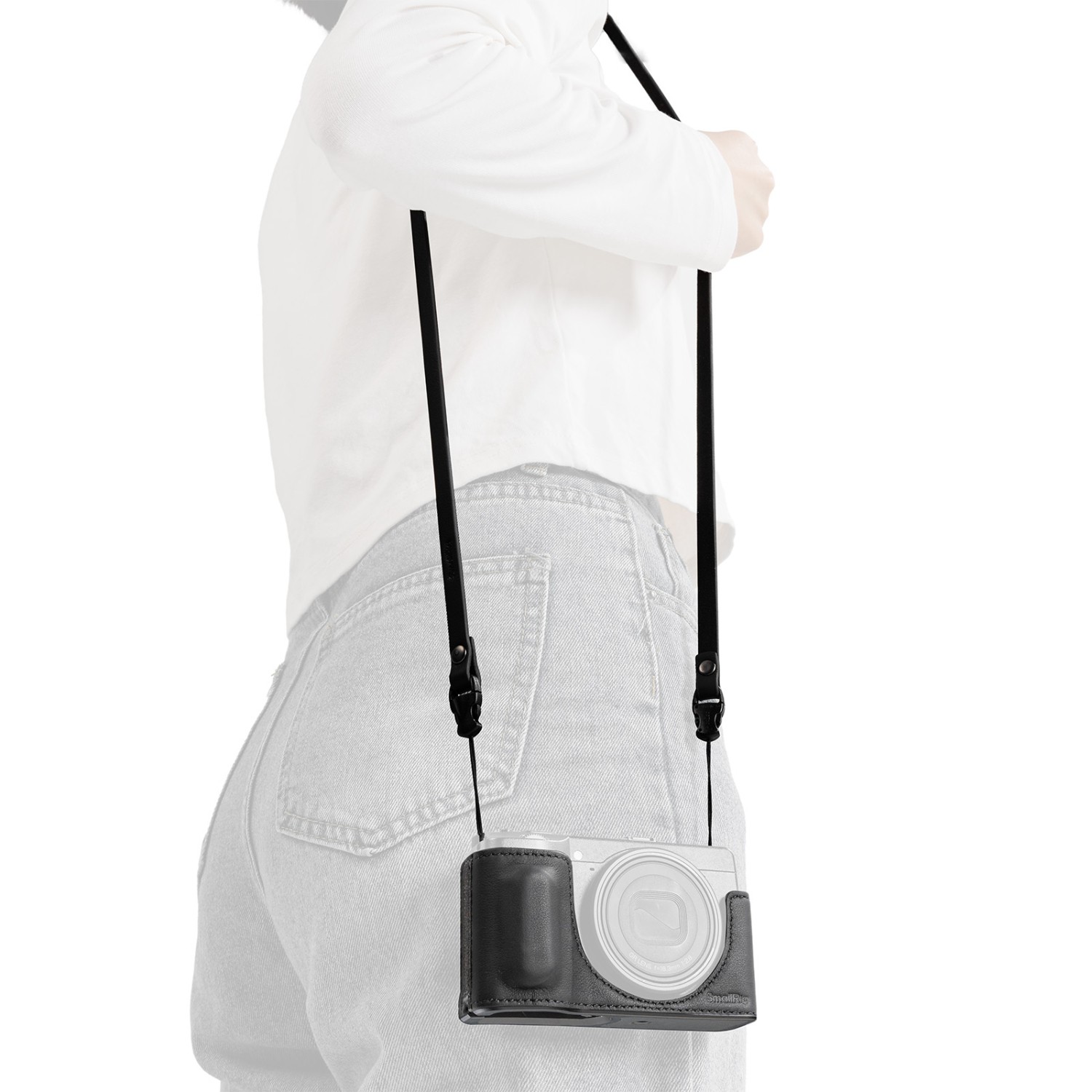 La correa de sujeción rápida para cámara SmallRig 5686 (negra) es una correa de cuero suave diseñada para las cámaras de la serie Ricoh GR, que ofrece un transporte seguro y cómodo gracias a su hebilla de sujeción rápida y a sus opciones universales de sujeción al cuello, al hombro o a la muñeca.