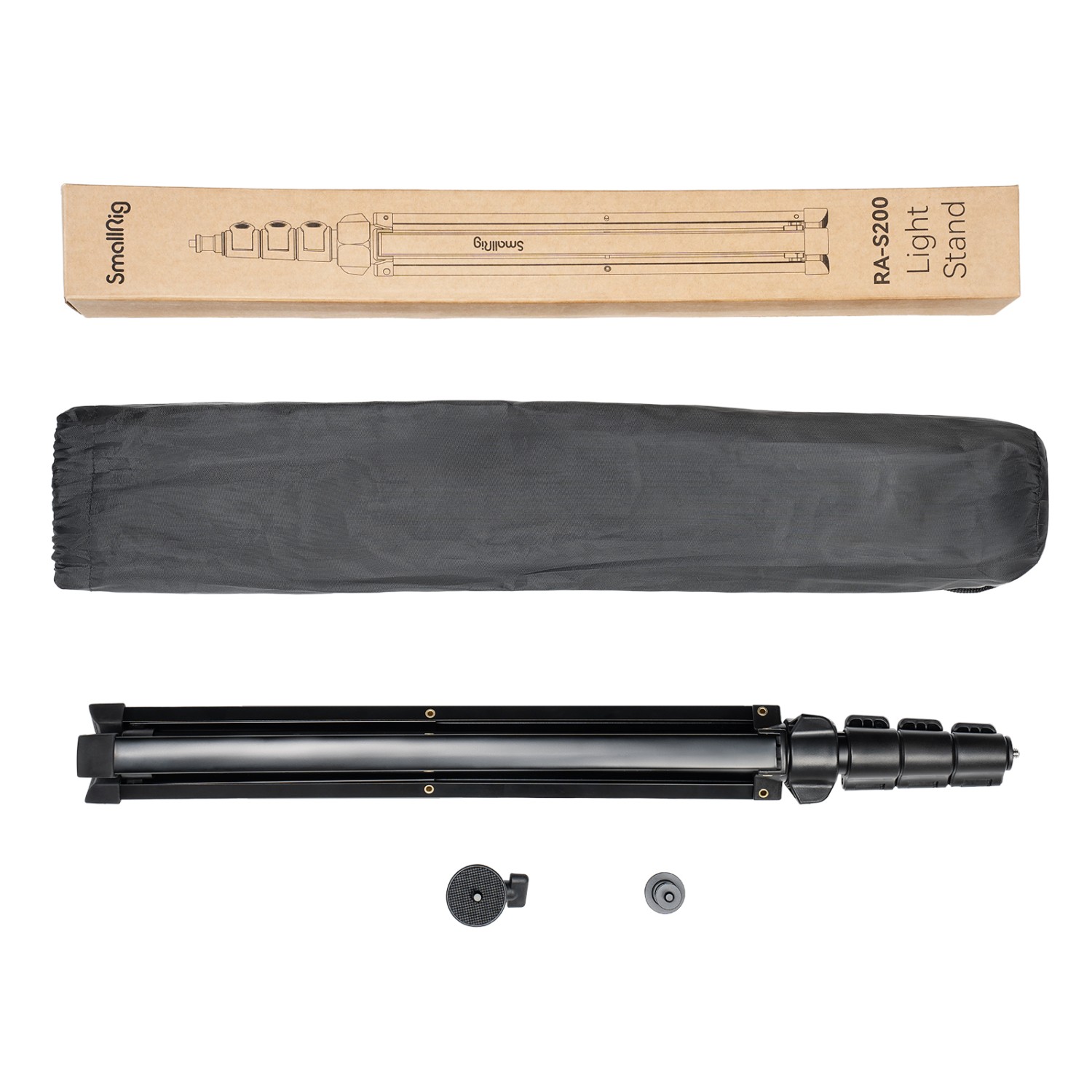 El soporte de iluminación SmallRig RA-S200 4379 es ligero y portátil. Su orificio roscado de 1/4" es compatible con linternas, luces circulares, luces de panel, micrófonos, luces COB de bajo consumo y otros accesorios. Su altura ajustable de 56 a 200 cm y su longitud de 56 cm cuando está plegado contribuyen a su diseño compacto. Este artículo, fabricado principalmente en aleación de aluminio, está equipado con patas de 20 mm de grosor, lo suficientemente resistentes como para soportar hasta 4 kg. También se suministra con una bolsa de almacenamiento y una rótula metálica, adecuada para diversos escenarios fotográficos.