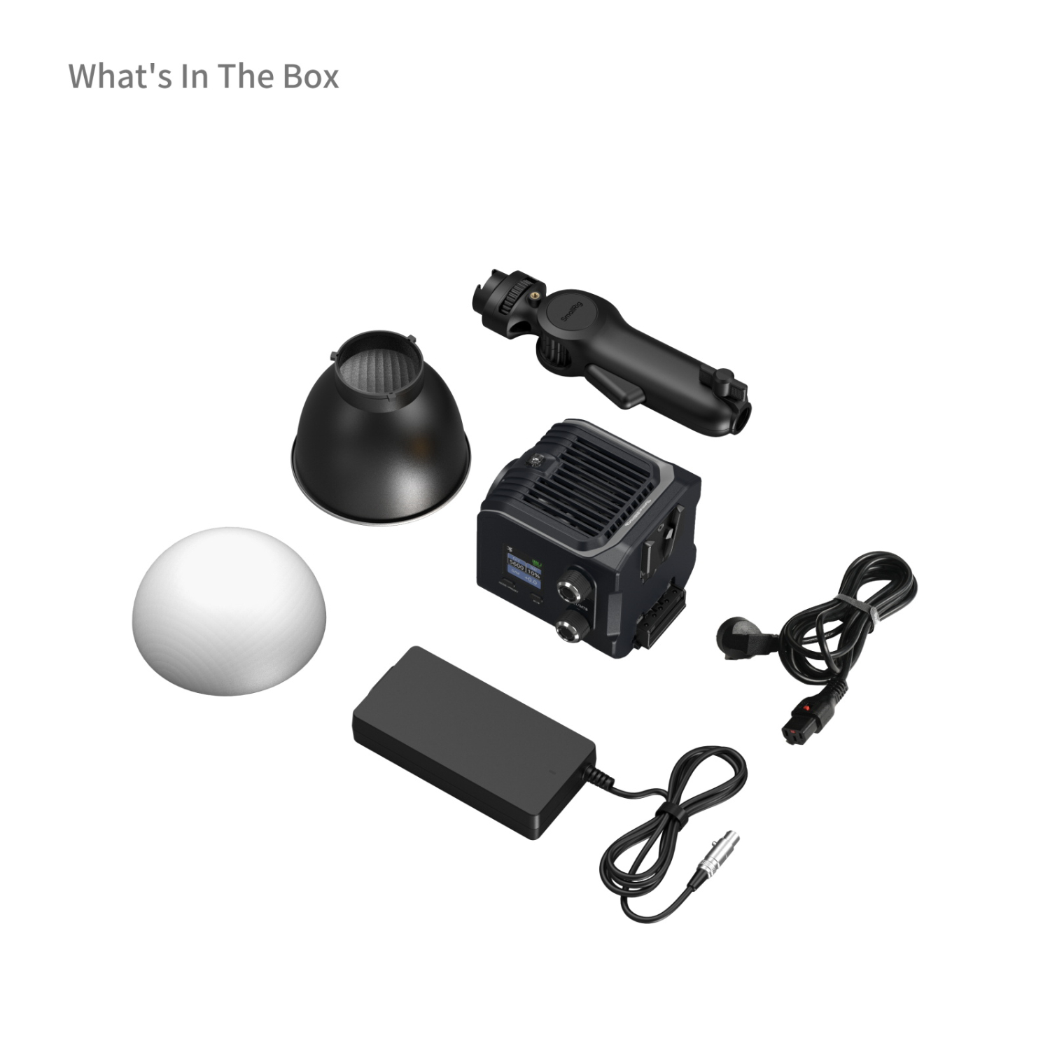 El dispositivo ofreceopciones de alimentación versátiles, tanto inalámbricas como por cable, lo que permite grabar sin interrupciones. Se puede cargar mediante un adaptador de alimentación de CC con una potencia de entrada de hasta 110 W, o a través del puerto USB-C con una potencia de entrada de hasta 110 W para cargarlo con accesorios como el SmallRig 73Wh Power Grip, baterías externas PD, cargadores PD, etc. Se pueden conectardos baterías NP-F970 a la luz. Además, la luz incluye una base V-lock compatible con baterías V-mount estándar.