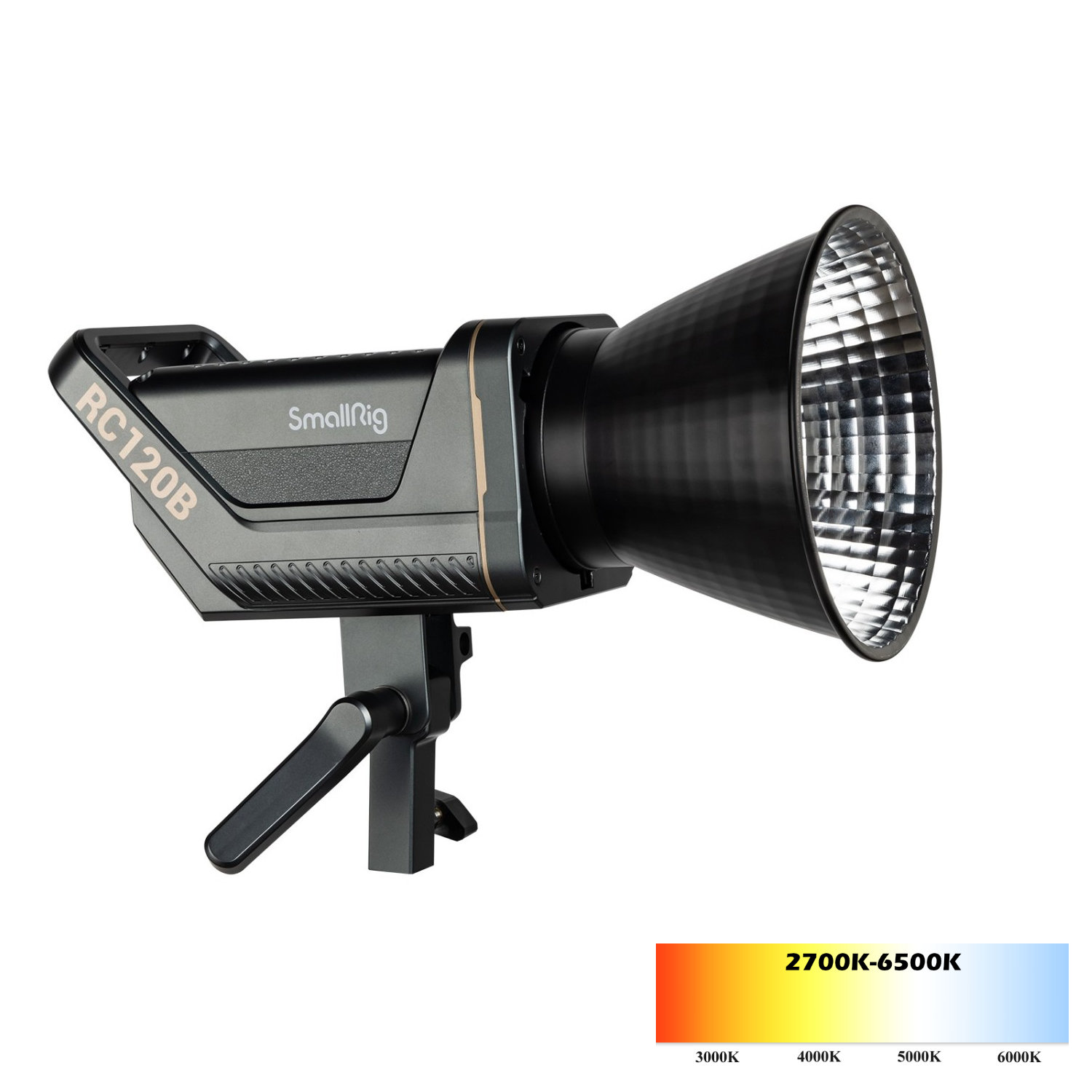 El SmallRig RC120B (3615) es un representante de la primera generación de luces LED profesionales de estudio de la marca SmallRig. Utiliza la moderna tecnología LED COB (Chip-On-Board) para ofrecer una alta intensidad (4.450 lux), así como un reflector de alta eficiencia para alcanzar una intensidad de hasta 52.800 lux en el centro del haz luminoso a una distancia de 1 m. También ofrece una alta precisión cromática (CRI 95+, TLCI 96+), una montura Bowens para facilitar el montaje de accesorios estándar (softboxes, etc.) y nueve efectos integrados (Paparazzi, Firework, Lightning, Fault Bulb, TV, Breath, Flash, Party, Flame), que, junto con el ajuste continuo de la intensidad, se pueden controlar tanto manualmente como de forma inalámbrica mediante la aplicación SmallGoGo.