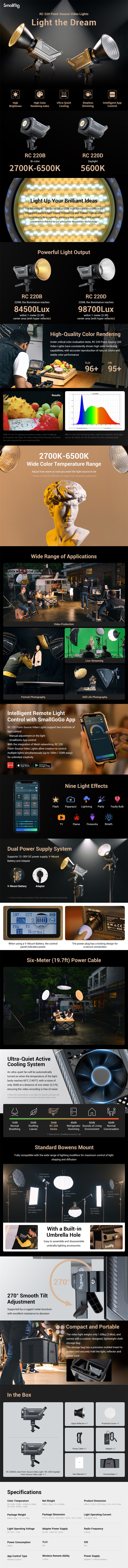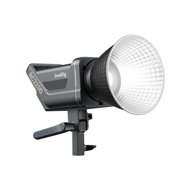El SmallRig RC220D (3618) es otro modelo, más potente, de la primera generación de luces LED profesionales de estudio de la marca SmallRig. Utiliza la moderna tecnología LED COB (Chip-On-Board) para ofrecer una alta intensidad (10 100 lx), así como un reflector de alta eficiencia para alcanzar una intensidad de hasta 98 700 lx en el centro del haz luminoso a una distancia de 1 m. También ofrece una alta precisión cromática (CRI 95+, TLCI 96+), una montura Bowens para facilitar el montaje de accesorios estándar (softboxes, etc.) y nueve efectos integrados (Paparazzi, Firework, Lightning, Fault Bulb, TV, Breath, Flash, Party, Flame), que, junto con el ajuste continuo de la intensidad, se pueden controlar tanto manualmente como de forma inalámbrica mediante la aplicación SmallGoGo. La variante RC220D tiene una temperatura de color preestablecida de 5600 K (+/- 200 K) y una intensidad máxima de 10 100 lx o 98 700 lx con el reflector instalado.