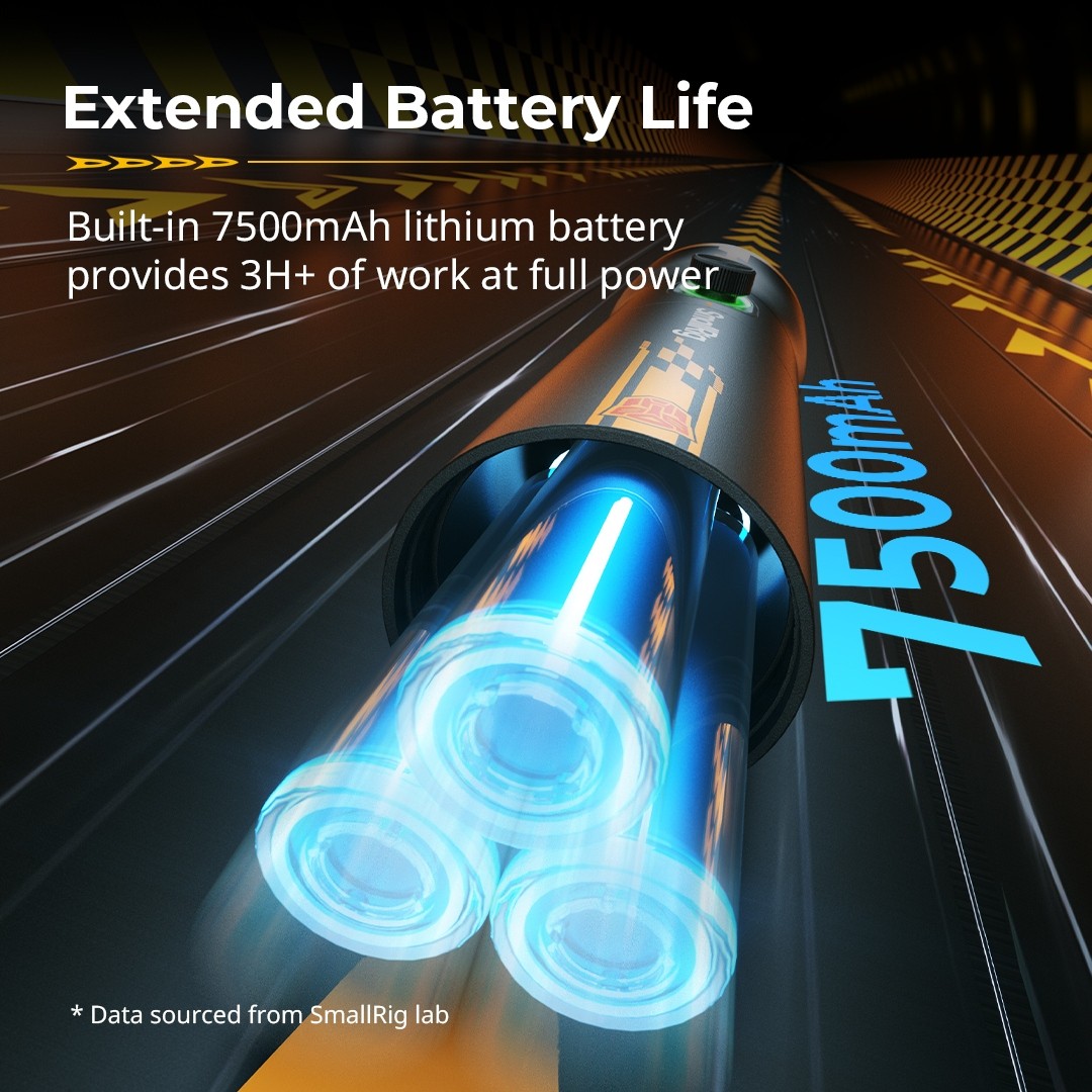 · Larga duración de la batería: la batería de litio integrada con una capacidad de 7500 mAh admite la carga a través de USB-C y proporciona hasta 3 horas de rendimiento completo para una sesión fotográfica ininterrumpida.
