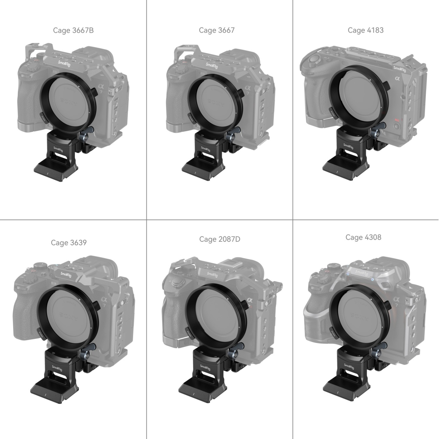 Compatible con la jaula de los kits 4198 / 3668 / 3668B / 3669 / 3669B / 3708 / 3710 / 4139 / 4184; no compatible con la abrazadera para el cable HDMI ni con la empuñadura lateral en la orientación vertical.