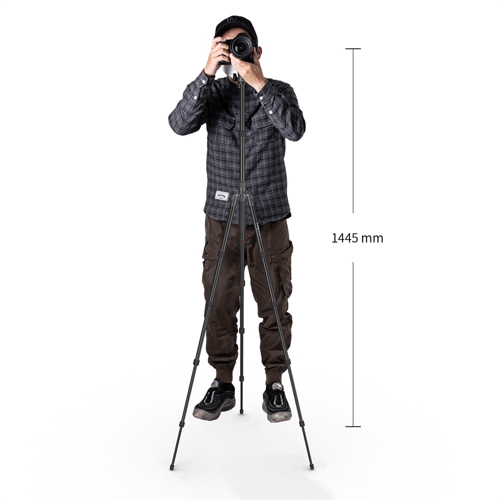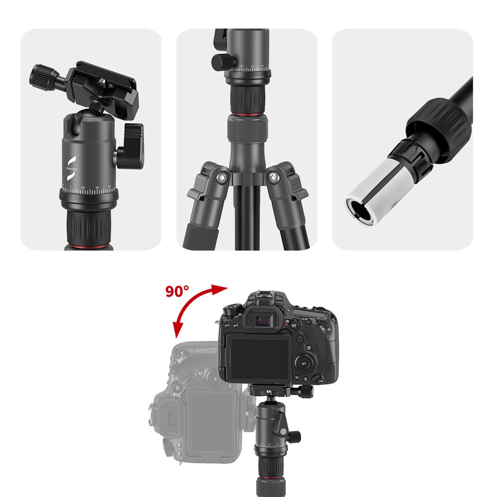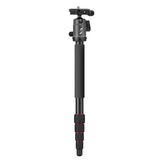 El trípode portátil de aluminio para cámara SmallRig Selection PT10 3257 está fabricado en aleación de aluminio y tiene una capacidad de carga segura de 8 kg. El trípode es compatible con cámaras réflex digitales, cámaras sin espejo, etc. Sus patas de cinco secciones, aseguradas con cierres giratorios, permiten una altura máxima de trabajo de 1445 mm y una estabilidad excelente. Está equipado con un sistema de plegado inverso que permite reducir la longitud del trípode plegado a tan solo 325 mm, lo que facilita su transporte. Su columna central giratoria de dos secciones permite realizar tomas en ángulo bajo y macro. El monopié desmontable aporta una gran flexibilidad. El trípode está equipado con una rótula que permite la captura panorámica y una placa de fijación rápida tipo Arca-Swiss para cambiar rápidamente entre el disparo a mano alzada y el disparo con trípode.