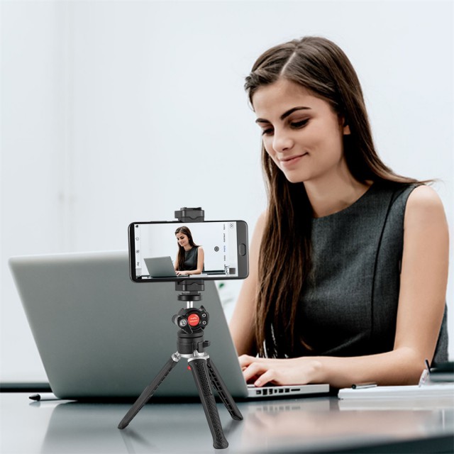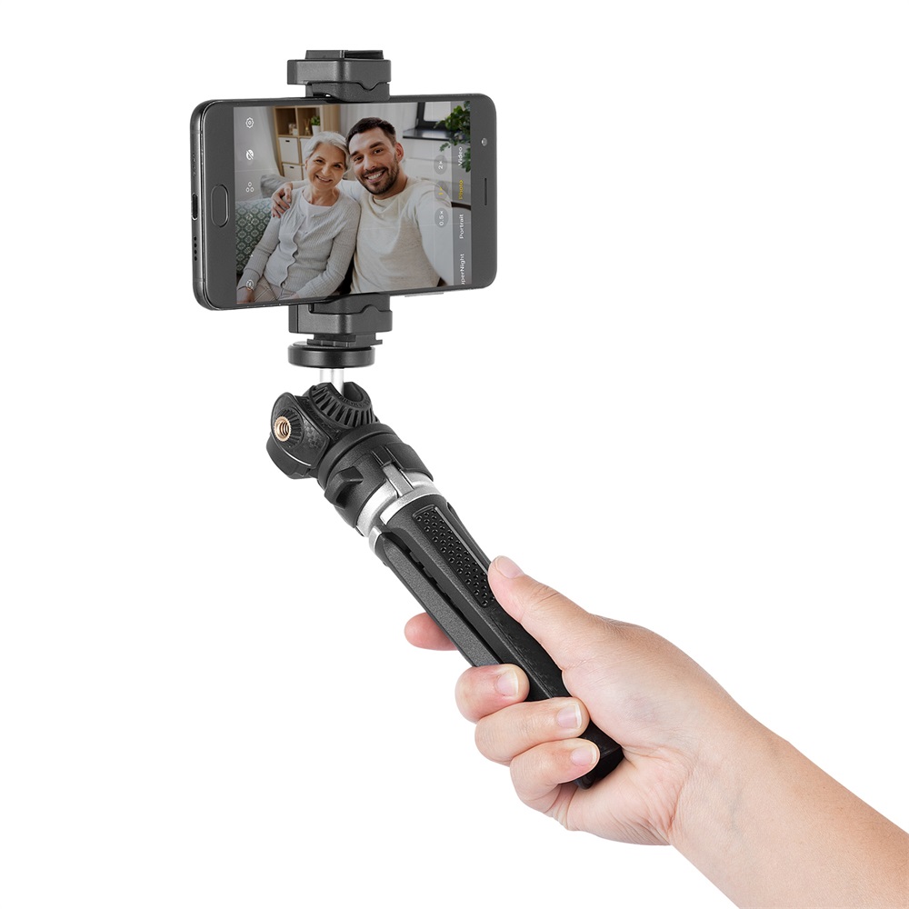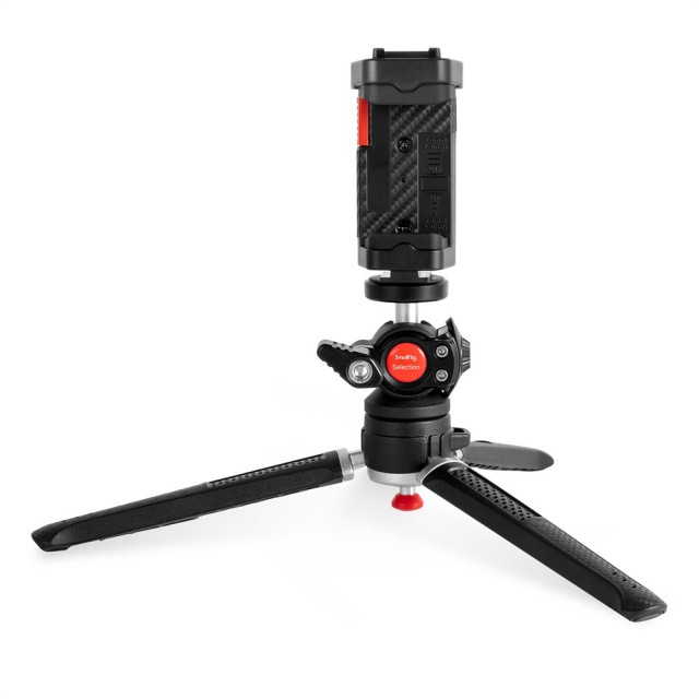 El trípode de mesa SmallRig Selection DT-02 3256 es un minitrípode ligero y compacto con una capacidad de carga segura de hasta 2 kg. Es ideal para cámaras sin espejo, cámaras compactas, teléfonos inteligentes, cámaras de acción, etc. Pulsando el botón situado en la parte inferior, puedes cambiar fácilmente entre las diferentes alturas del trípode. La rótula permite capturar imágenes desde diferentes ángulos y cuenta con un orificio de montaje estándar de 1/4"-20 para fijar un brazo u otros accesorios. También dispone de un soporte de fijación rápida para smartphones con un ancho de entre 56 mm y 86 mm. El controlador Bluetooth incluido permite un manejo aún más sencillo con el smartphone.