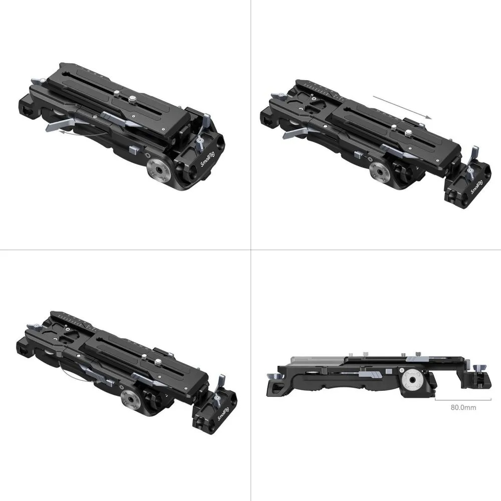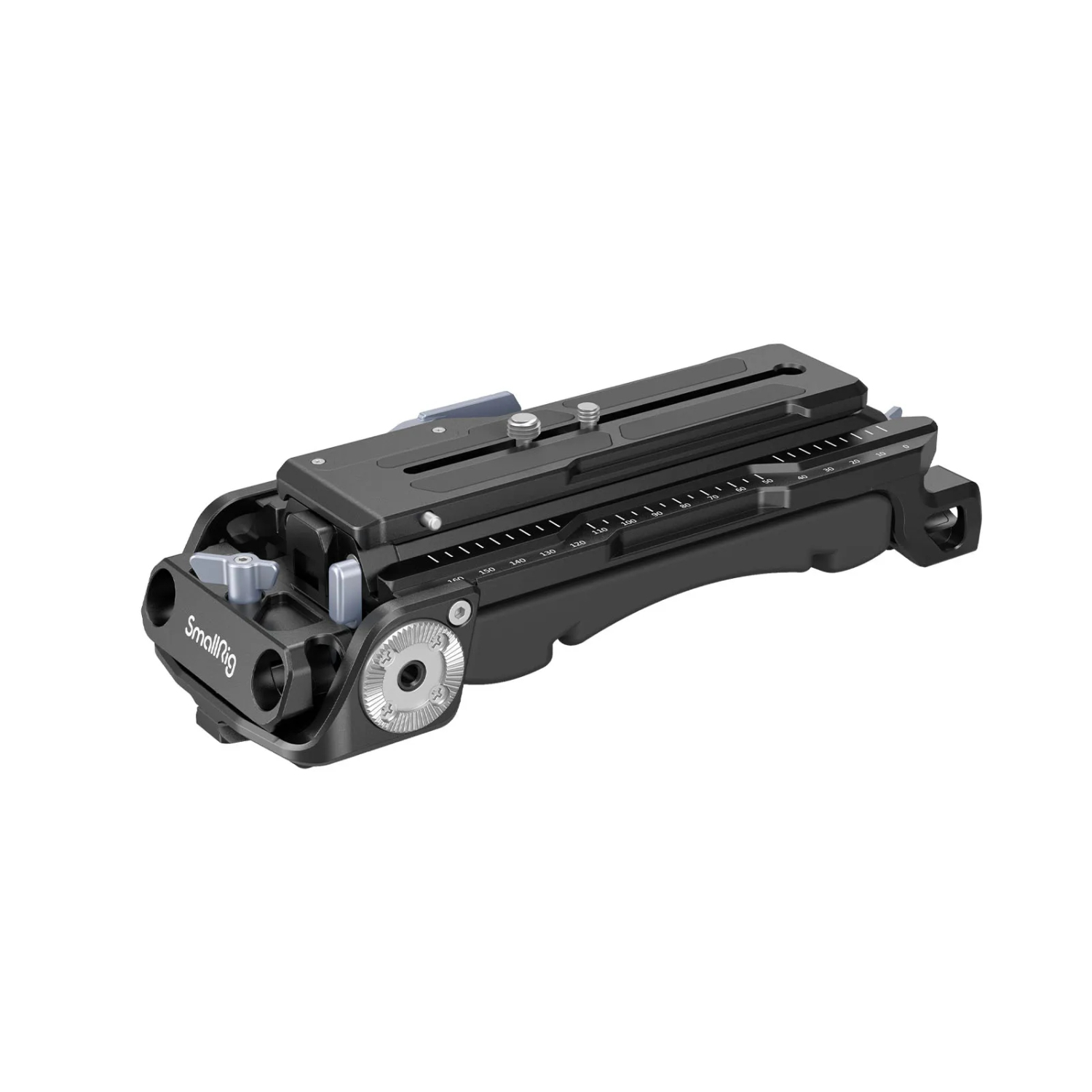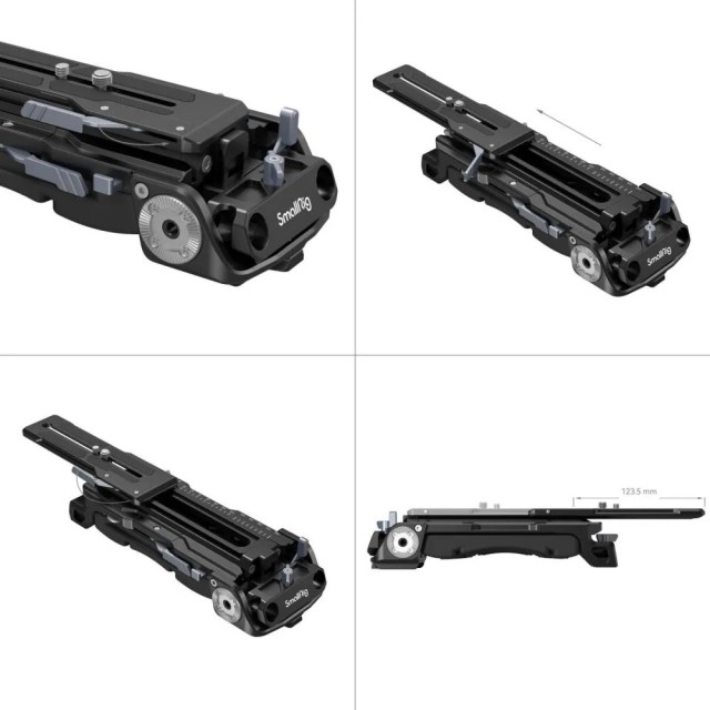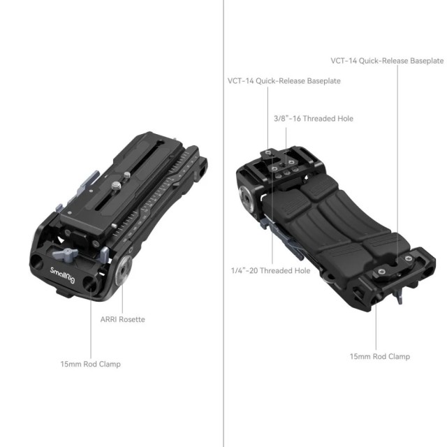 El soporte de hombro universal (compatible con la placa Sony VCT-14) 2837C está diseñado para la placa base de fijación rápida Sony VCT-14. Se compone de una placa de fijación rápida SmallRig en la parte superior, a la que se fija la cámara, y de una placa de fijación rápida Manfrotto 501 que conecta la almohadilla del hombro. El modelo 2837B permite cambiar rápidamente entre el disparo desde el hombro, el disparo a mano alzada y el disparo con trípode. A ambos lados está equipado con un soporte de rosca M6 ARRI estándar, compatible con la empuñadura de control original de las cámaras 1810 o FX9, así como con un sistema doble de barras en los extremos delantero y trasero con un diámetro de 15 mm y un paso de 60 mm. En particular, el soporte de la barra delantera se puede ajustar verticalmente en 27 mm para garantizar una distancia de 85 mm entre el centro del objetivo y el centro de la barra para cámaras como la FX9, FS5, URSA MINI, CANON C300, etc. El modelo 2837B también ayuda a equilibrar la cámara en un brazo o una plataforma e instalar un sistema de follow focus y matte box gracias a la placa de fijación rápida Manfrotto 501 integrada con un desplazamiento de 0-80 mm hacia delante y a la placa de fijación rápida SmallRig con un desplazamiento de 0-120 mm hacia atrás. No es necesario desmontar primero el sistema de follow focus o el matte box, ya que el sistema de barras delanteras se acopla a la placa Manfrotto 501. Otras características del modelo 2837B incluyen orificios con rosca de 1/4"-20 y orificios con rosca de 3/8"-16 en la placa inferior en forma de V, que admiten diversas placas de fijación rápida y trípodes adicionales. El artículo se suministra con una nueva almohadilla de silicona para el hombro, diseñada ergonómicamente para que los hombros se sientan suaves y cómodos. Además, incorpora una llave plana para facilitar el acceso.
