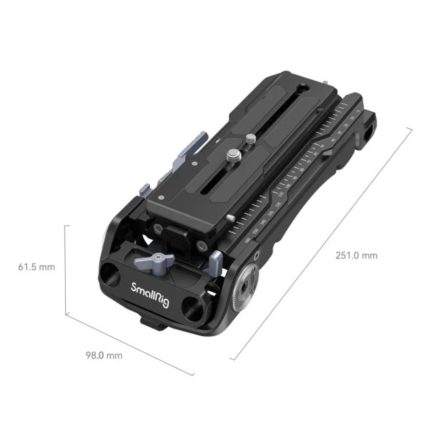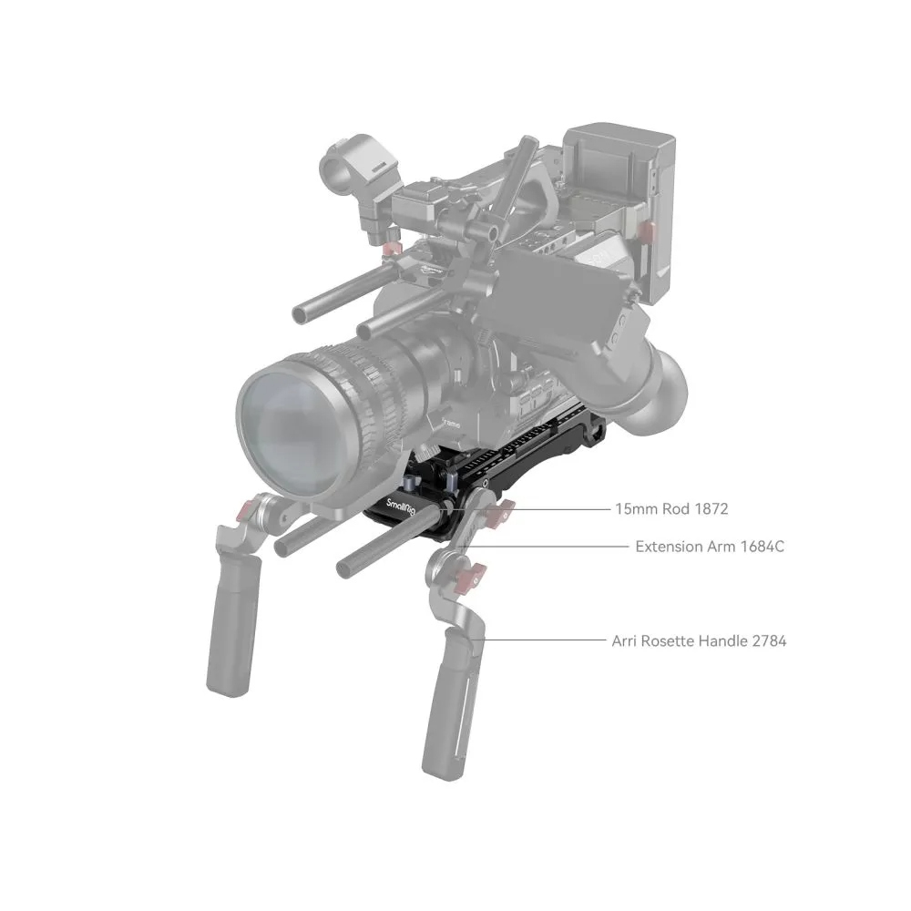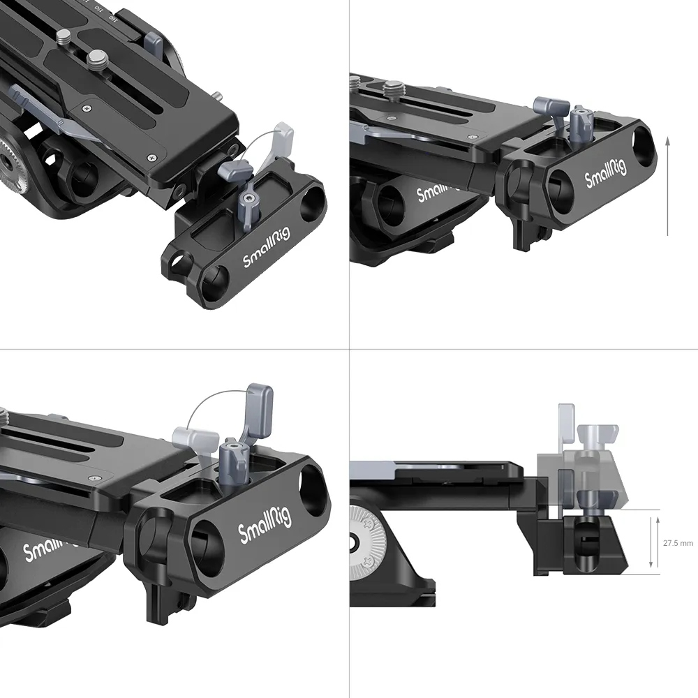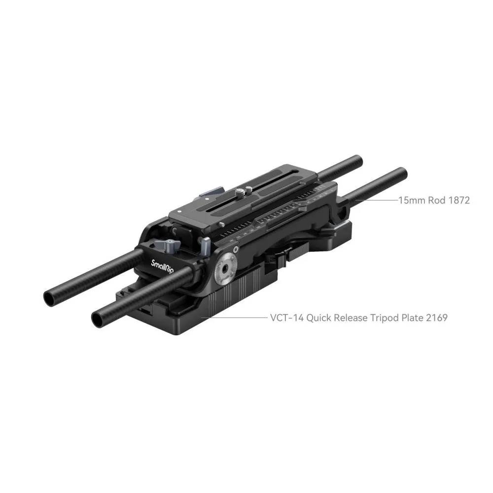 El soporte de hombro universal (compatible con la placa Sony VCT-14) 2837C está diseñado para la placa base de fijación rápida Sony VCT-14. Se compone de una placa de fijación rápida SmallRig en la parte superior, a la que se fija la cámara, y de una placa de fijación rápida Manfrotto 501 que conecta la almohadilla del hombro. El modelo 2837B permite cambiar rápidamente entre el disparo desde el hombro, el disparo a mano alzada y el disparo con trípode. A ambos lados está equipado con un soporte de rosca M6 ARRI estándar, compatible con la empuñadura de control original de las cámaras 1810 o FX9, así como con un sistema doble de barras en los extremos delantero y trasero con un diámetro de 15 mm y un paso de 60 mm. En particular, el soporte de la barra delantera se puede ajustar verticalmente en 27 mm para garantizar una distancia de 85 mm entre el centro del objetivo y el centro de la barra para cámaras como la FX9, FS5, URSA MINI, CANON C300, etc. El modelo 2837B también ayuda a equilibrar la cámara en un brazo o una plataforma e instalar un sistema de follow focus y matte box gracias a la placa de fijación rápida Manfrotto 501 integrada con un desplazamiento de 0-80 mm hacia delante y a la placa de fijación rápida SmallRig con un desplazamiento de 0-120 mm hacia atrás. No es necesario desmontar primero el sistema de follow focus o el matte box, ya que el sistema de barras delanteras se acopla a la placa Manfrotto 501. Otras características del modelo 2837B incluyen orificios con rosca de 1/4"-20 y orificios con rosca de 3/8"-16 en la placa inferior en forma de V, que admiten diversas placas de fijación rápida y trípodes adicionales. El artículo se suministra con una nueva almohadilla de silicona para el hombro, diseñada ergonómicamente para que los hombros se sientan suaves y cómodos. Además, incorpora una llave plana para facilitar el acceso.