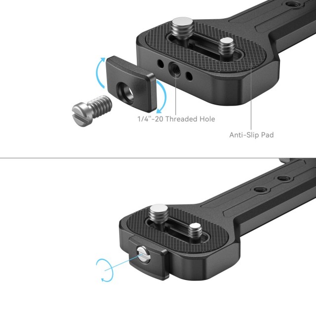 Está equipada con varias roscas de 1/4" -20, ARRI 3/8" -16 y una zapata para fijar accesorios, como el trípode original del gimbal, la placa de cámara y el soporte para monitor 2346. La empuñadura se puede configurar para la mano derecha o izquierda según sus necesidades. El paquete incluye un destornillador plano para fijar el tornillo del mango, que se encuentra en la parte inferior.