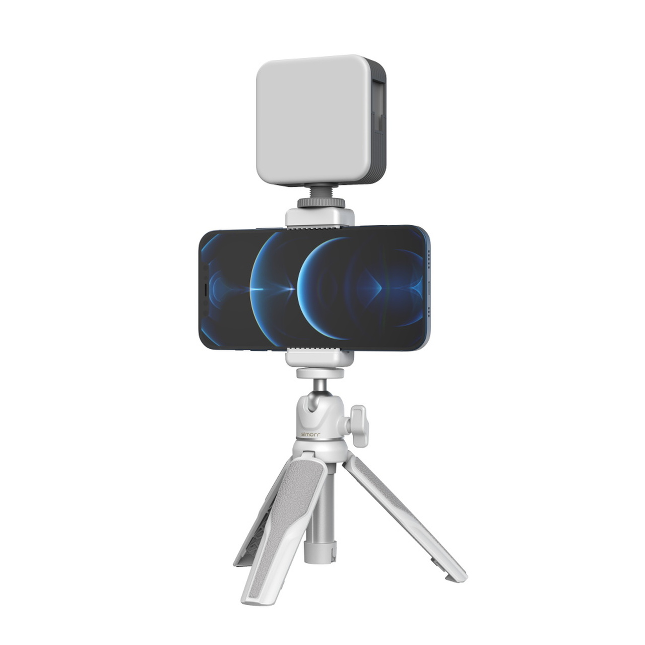 El kit Smallrig Simorr Vigor VK-30 Vlog Kit 3509 se compone de un trípode portátil para vlogs, un clip estándar para el teléfono y una luz LED Vibe P96, por lo que resulta compacto y fácil de transportar. El trípode se fija al clip para el teléfono mediante un tornillo de 1/4, y el clip para el teléfono se fija a la luz mediante una zapata estándar en la parte superior; además, la luz cuenta con 3 orificios estándar que se pueden ampliar para añadir más accesorios. El trípode soporta con seguridad 1,5 kg. La luz LED P96 tiene un rango de temperatura de color de 2700 K a 6500 K y una autonomía máxima de 13,5 horas.