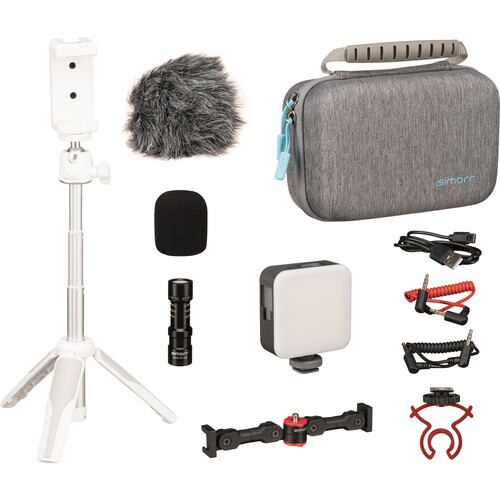 simorr Vigor VK-50 White Vlog Kit 3752. El kit se compone de un trípode portátil para vlogs, un clip estándar para el teléfono, un micrófono Wave S1 lite, una luz Vibe P96, una barra extensible con doble zapata cold shoe y una funda de transporte; es compacto y está diseñado para grabaciones en exteriores. El trípode y el clip para el teléfono móvil utilizan…