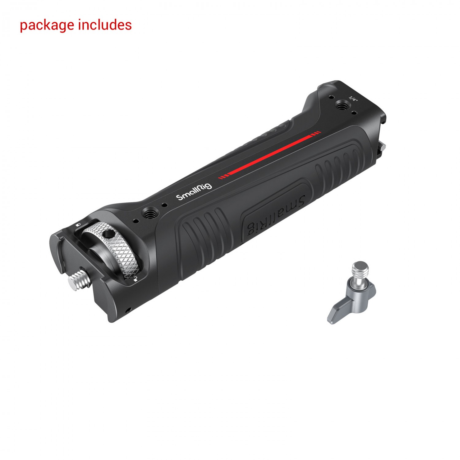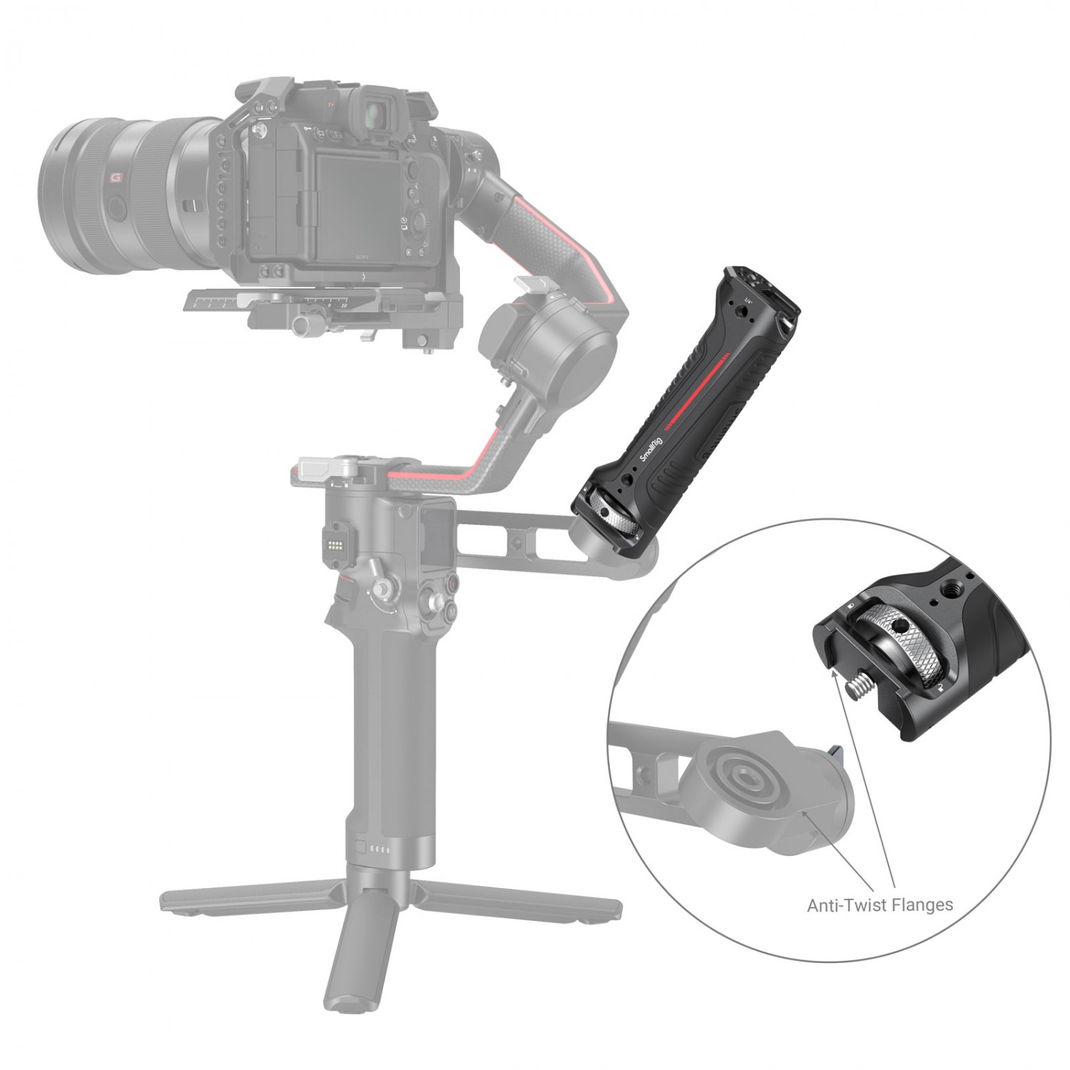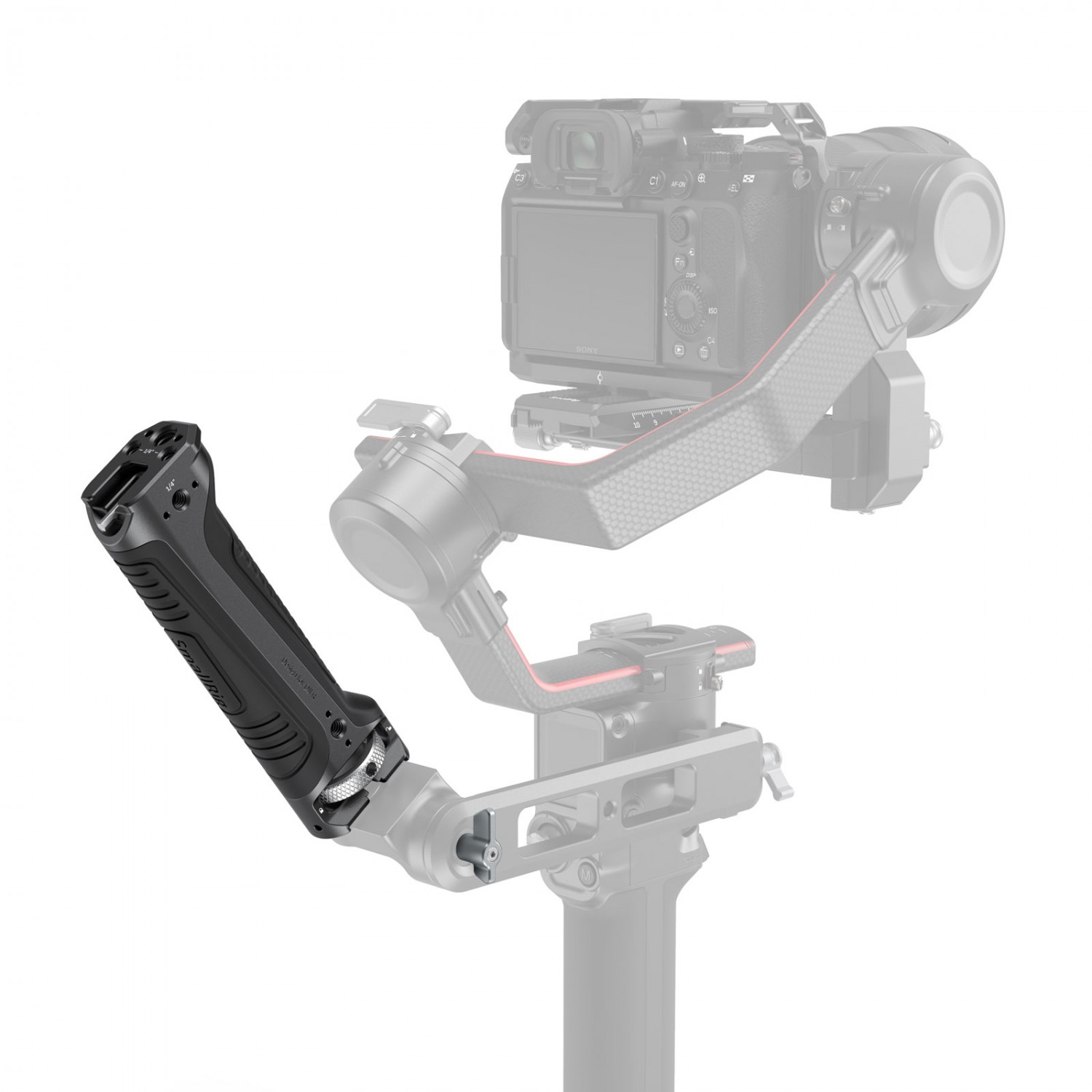 La empuñadura tipo bandolera SmallRig para el gimbal DJI RS 2 y RSC 2 (3161) estáespecialmente diseñada para reducir la fatiga de las manos al grabar con el gimbal en ángulos bajos y ofrece puntos de montaje para accesorios. La empuñadura se fija al asa del maletín DJI R mediante un tornillo de 1/4"-20 y cuenta con un borde elevado que evita que se gire. En la parte superior del mango hay dos orificios roscados de 1/4"-20, un orificio de posicionamiento ARRI de 3/8"-16 y un soporte cold shoe para montar el soporte de monitor 2903 o 2905