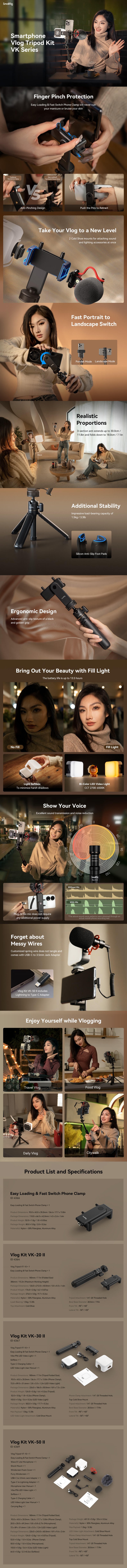 El kit de trípode SmallRig Smartphone Vlog Tripod Kit VK-30 Advanced Version 4367 se compone de un trípode telescópico de mesa, un soporte para smartphone Easy Loading y una luz LED para vídeo Vibe P96. Este kit compacto y portátil tiene una impresionante capacidad de carga de 1,5 kg. El trípode se fija al soporte para smartphone mediante un solo tornillo de 1/4"-20; este soporte cuenta con un diseño único de inserción fácil que permite colocar y retirar el smartphone rápidamente.