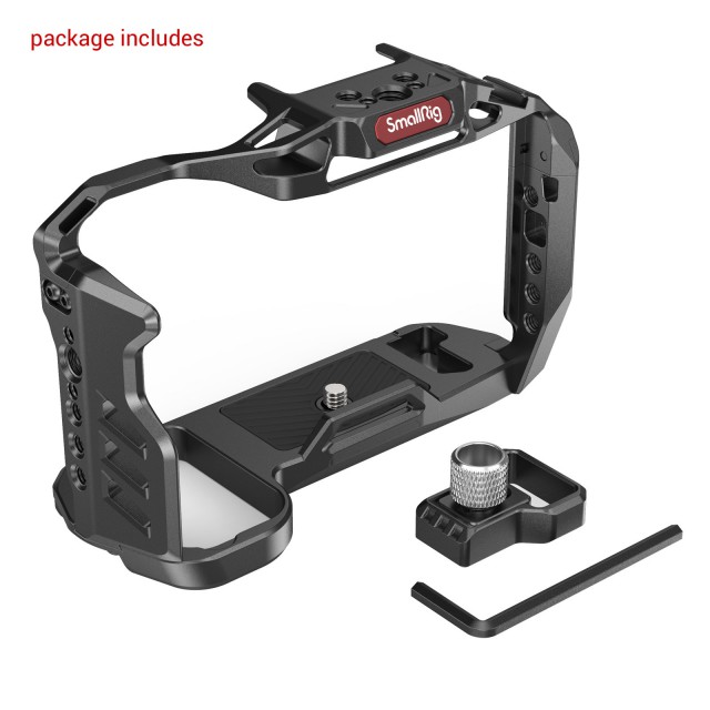 El kit de jaula estándar SmallRig para la Sony Alpha 7S III 3180 fija la cámara de forma segura mediante un tornillo de 1/4"-20 en la parte inferior y un tornillo M2,5 en el lateral. El tornillo M2,5 debe pasar por los orificios de la correa de hombro situados en el lateral de la cámara. La jaula 3065 está equipada con varios puntos de montaje estándar y ofrece acceso completo a todos los puertos, la parte inferior y la tapa de la batería de la cámara. Además de varios orificios roscados de 1/4"-20, 3/8"-16 y orificios para la correa de hombro, la jaula también está equipada con rieles NATO estándar y soportes para zapata fría. En la jaula se pueden montar accesorios como el soporte SmallRig Monitor Mount 2904, micrófonos, el asa lateral SmallRig 2187 y el HSN2093, entre otros. Para evitar que el cable HDMI de la cámara se desconecte accidentalmente, la jaula está equipada con una abrazadera para el cable HDMI que se puede fijar al lateral de la jaula mediante un tornillo de 1/4"-20, y cuya parte de sujeción es ajustable. La jaula está fabricada con una aleación de magnesio y aluminio, lo que reduce el peso en un 40 % en comparación con una jaula tradicional. Además, en la parte inferior de la jaula hay un destornillador magnético que te facilitará el montaje.