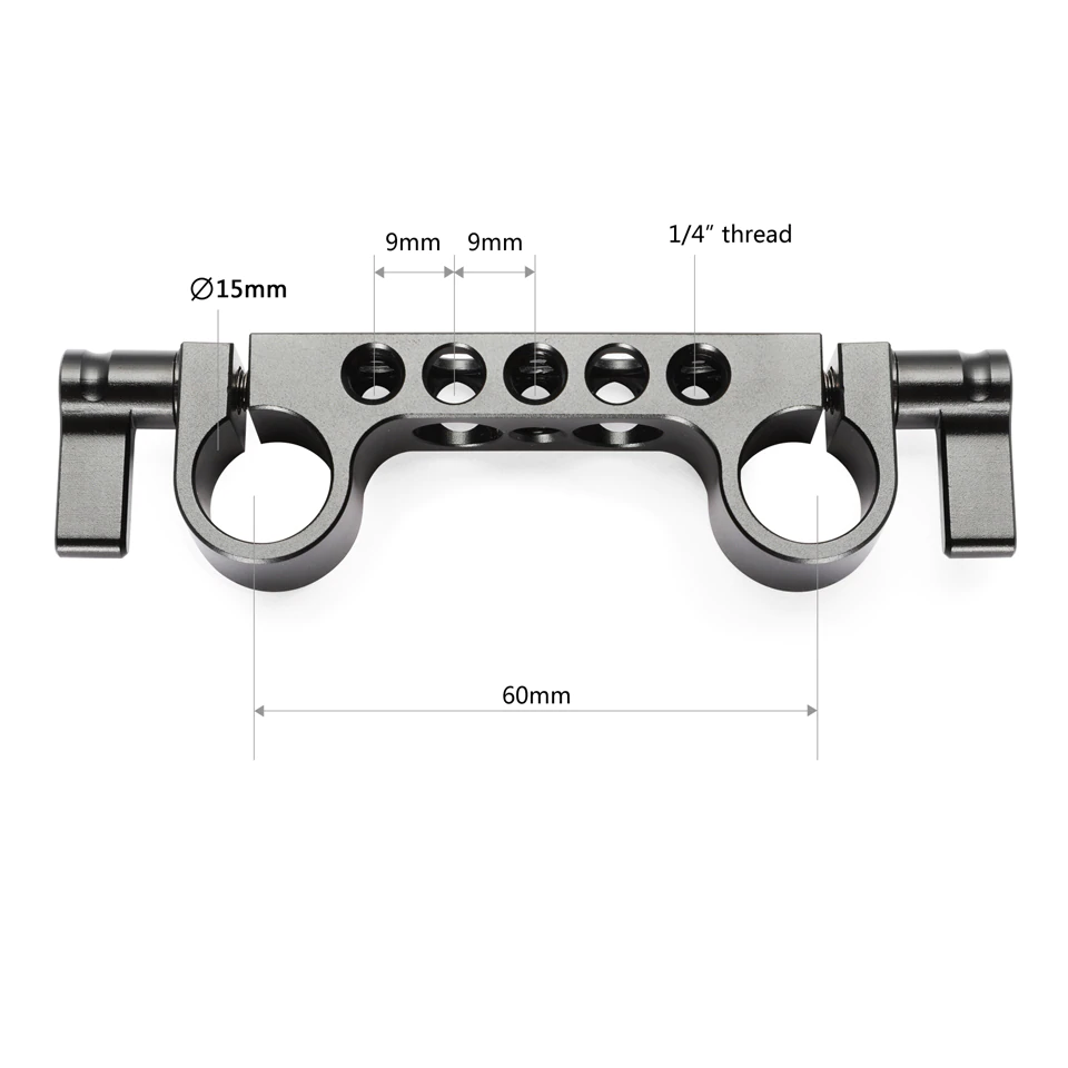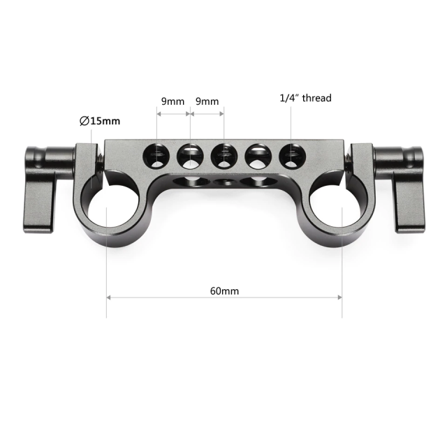 El SmallRig Super Lightweight 15mm-Railblock (paquete de 2 unidades) 2061 incluye 2 unidades de Railblock superligeros de 15 mm. Cada Super Lightweight 15mm-Railblock se suministra con dos abrazaderas para barras de 15 mm, que se pueden apretar mediante 2 tuercas de mariposa giratorias. El ajuste de una tuerca de mariposa no afecta al funcionamiento de la otra. Además, está equipado con varios orificios roscados de 1/4'' para operaciones de bricolaje.