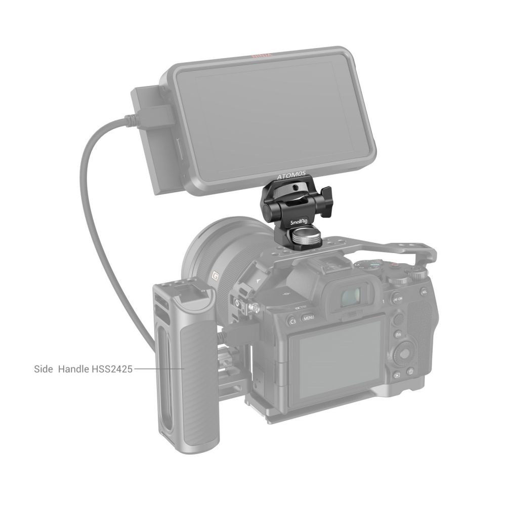 El soporte ajustable para monitor SmallRig Swivel and Tilt Adjustable Monitor Mount con montura tipo ARRI 2903 está diseñado para fijar un monitor a una jaula de cámara u otro sistema de montaje mediante una montura ARRI de 3/8"-16 con protección antirrotación. En la parte superior cuenta con un tornillo de 1/4"-20 para fijar un monitor, una luz o un micrófono. El soporte permite un giro lateral de 360° y una inclinación de 170°, con un tope libre en cualquier posición. La tensión de cada eje se puede ajustar con una llave Allen. Este robusto soporte está fabricado en aluminio mecanizado con CNC y soporta monitores de 5" y 7" con un peso de hasta 1,5 kg. El soporte giratorio e inclinable cuenta con un acolchado de goma protector en la parte superior y, para mayor seguridad, incluye una llave Allen para apretar los soportes. Además, la parte inferior está equipada con un orificio roscado de 1/4"-20 para ofrecer más posibilidades de personalización.