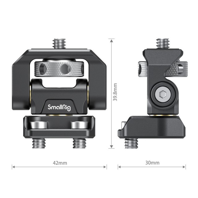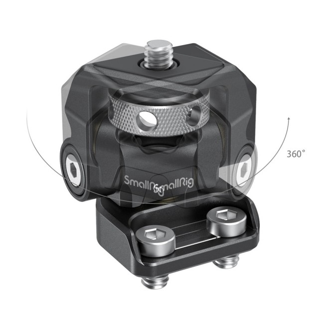 Soporte ajustable para monitor SmallRig con ajuste de giro e inclinación y tornillos. El soporte 2904 está diseñado para fijar un monitor a una jaula de cámara u otro sistema de montaje mediante dos tornillos de 1/4"-20 con fijación firme. En la parte superior hay un tornillo de 1/4"-20 para montar un monitor, una luz o un micrófono. El soporte permite girar 360° hacia los lados e inclinar 170°, con sujeción libre en cualquier posición. La tensión de cada eje se puede ajustar con una llave Allen. Este robusto soporte está fabricado en aluminio mecanizado con CNC y admite monitores de 5" y 7" con un peso de hasta 1,5 kg. El soporte giratorio e inclinable cuenta con un acolchado de goma protector en la parte superior e incluye una llave Allen para apretar los soportes y garantizar una mayor seguridad. Además, la base cuenta con dos orificios roscados de 1/4"-20 para ofrecer más posibilidades a los aficionados al bricolaje.