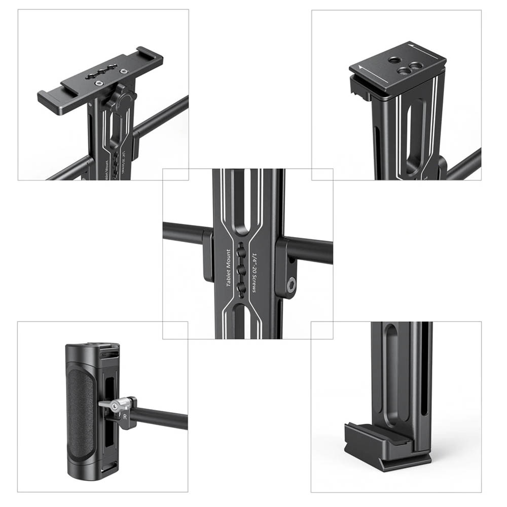 El soporte SmallRig para tabletas con doble asa para iPad 2929B está diseñado para facilitar el montaje del iPad o la tableta y su uso como monitor para el director. Es compatible con iPads de 7,9" a 12,9" de diagonal u otras tabletas de tamaño similar, tanto con funda protectora como sin ella. Las almohadillas de goma integradas evitan que se raye el iPad. Está equipado con dos asas extraíbles que se pueden ajustar libremente para un uso más cómodo con la mano. Las presillas para correas en las asas permiten fijar una correa de mano o una correa de hombro. Se suministra con una base tipo Arca-Swiss con un orificio roscado de 1/4" para el montaje y desmontaje rápido del trípode. También cuenta con varios orificios roscados de 1/4"-20 y dos soportes para zapata fría para fijar otros accesorios.