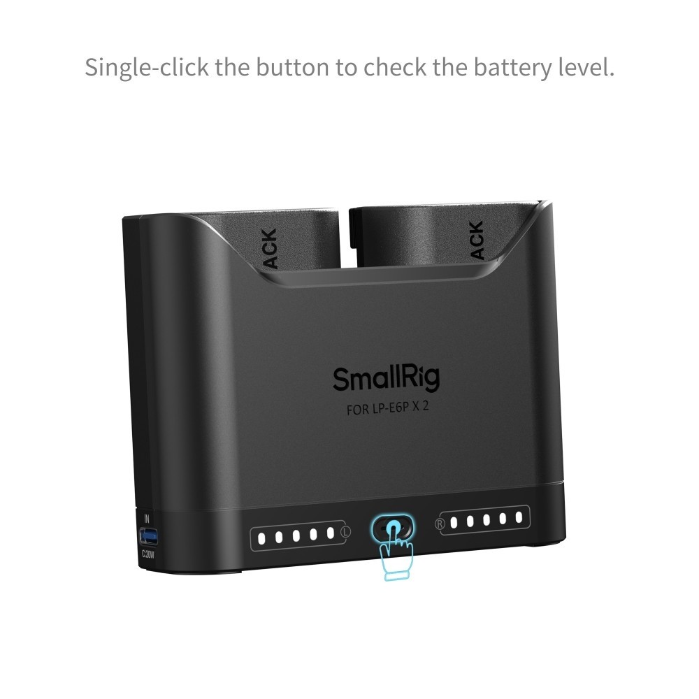 El kit de carga rápida SmallRig Turbo Charging Kit para baterías LP-E6NH para cámaras 5484 incluye dos baterías de alto rendimiento y un cargador rápido de dos canales. Gracias a su chip de decodificación completa, este kit garantiza una compatibilidad total con las baterías Canon LP-E6NH, elimina las advertencias emergentes y permite ver el estado de carga en la cámara, así como utilizar el cargador original.