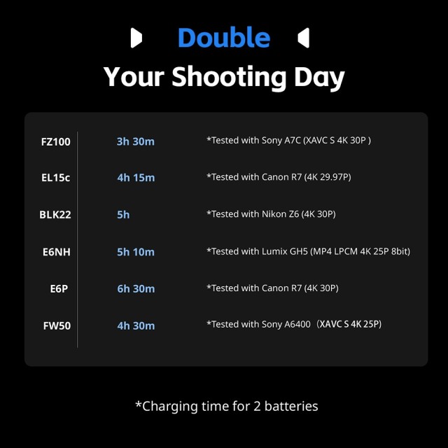 Cada batería ofrece una potencia nominal real de 1030 mAh, lo que garantiza un tiempo de disparo más prolongado para flujos de trabajo exigentes. El diseño de dos ranuras del cargador permite cargar dos baterías simultáneamente o cargar una sola batería; las dos baterías se cargan completamente en aproximadamente 1,5 horas, lo que garantiza una eficiencia óptima.