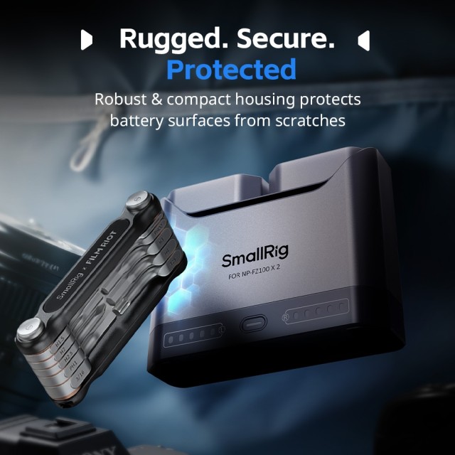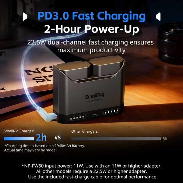 El kit de carga rápida SmallRig Turbo Charging Kit para baterías NP-FW50 de la cámara 5488 incluye dos baterías y un cargador rápido de dos canales. Gracias al chip de decodificación completa, este kit garantiza la total compatibilidad con las baterías Sony NP-FW50, elimina las advertencias emergentes y permite visualizar el estado de carga en la cámara, así como utilizar el cargador original.