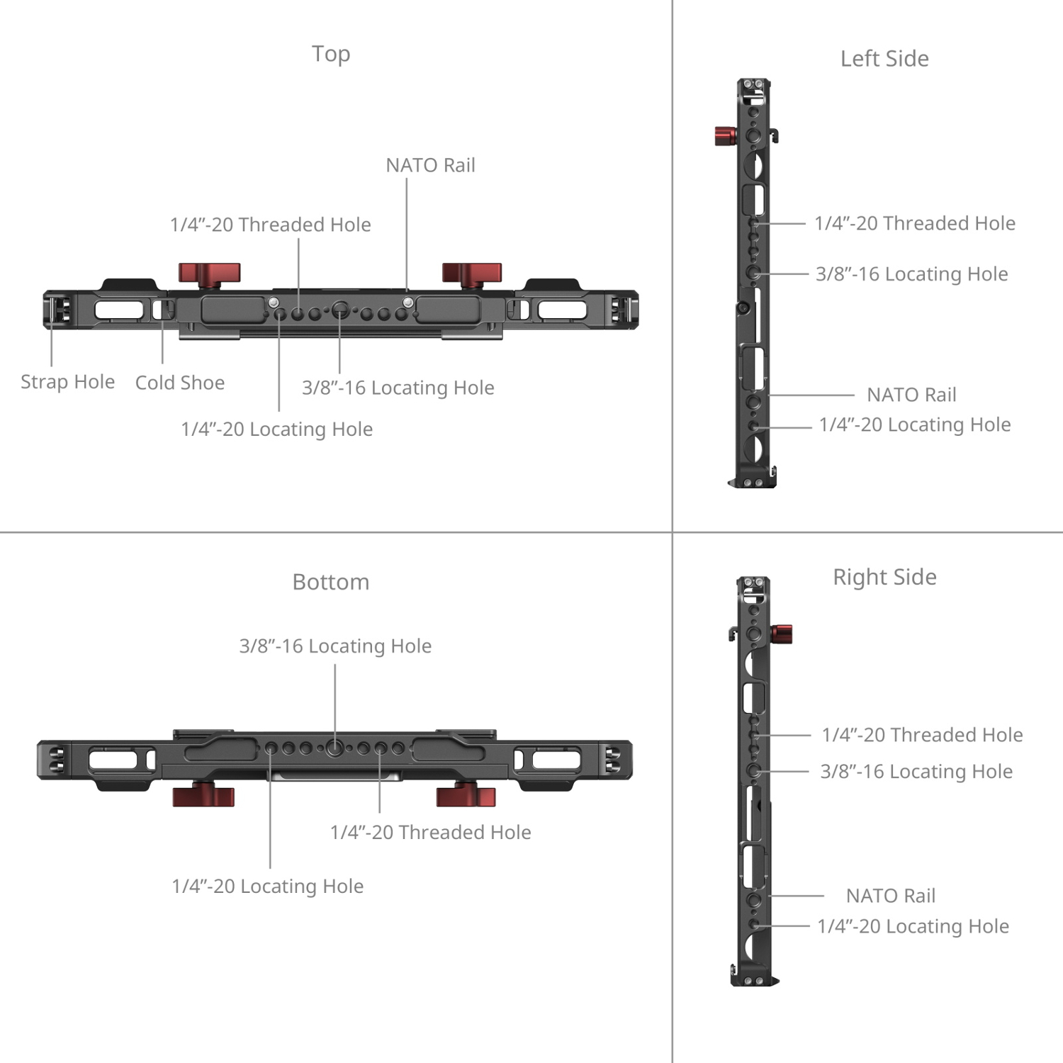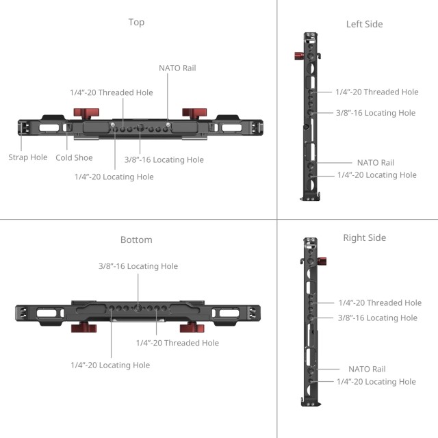 6. Orificios de posicionamiento integrados de 1/4"-20 y 3/8"-16, ranura para correa, soporte para calzado frío y riel NATO, que permiten fijar, por ejemplo, adaptadores NPF, soportes para baterías externas, soportes para SSD, asas, etc.