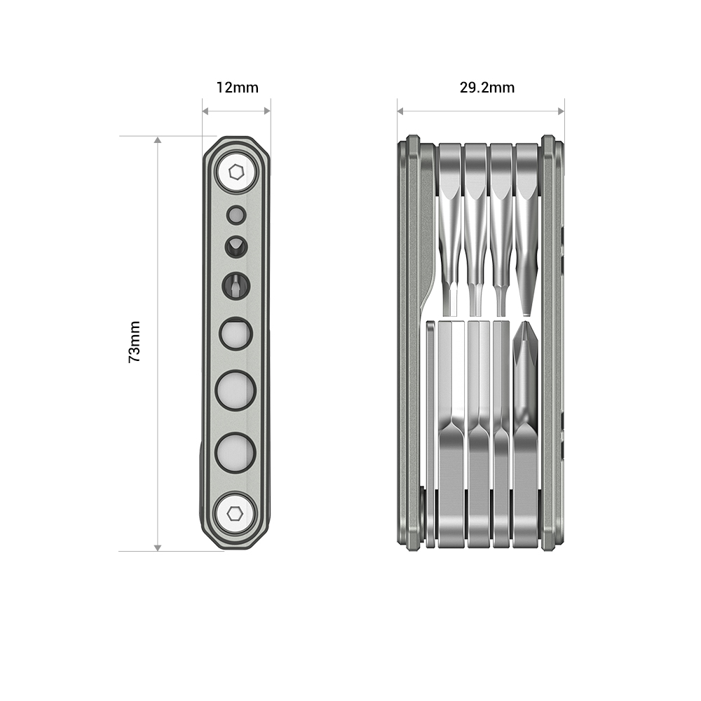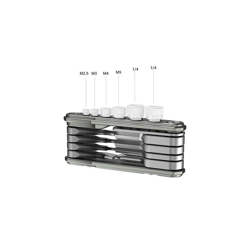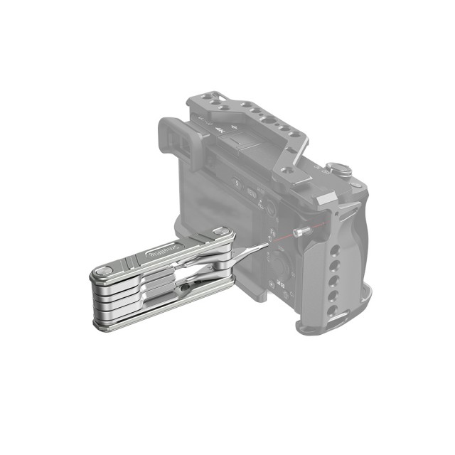 La herramienta multifuncional plegable universal SmallRig para videógrafos TC2713 combina 9 herramientas desplegables útiles para videógrafos con orificios de almacenamiento roscados, para que siempre tengas los tornillos a mano. Esta herramienta multifuncional, fabricada con herramientas de acero inoxidable y una carcasa de aluminio, consta de un destornillador plano ancho y uno estrecho, un destornillador de estrella PH1 y destornilladores H1.5, H2.0, H2.5, H3.0, H4.0 y 3/16