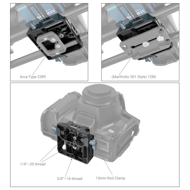 La placa base universal SmallRig LWS, ligera y compacta, con una abrazadera doble para varillas de 15 mm (modelo 3357), es compatible con las jaulas más comunes para cámaras réflex digitales y sin espejo del mercado. Funciona con una barra doble de 15 mm para fijar, por ejemplo, soportes de objetivos, follow focus y matte box, tanto al fotografiar y grabar a mano alzada como con trípode. Cuando se utiliza con la jaula BMPCC 6K Pro 3270, proporciona una altura óptica de 85 mm. Su parte inferior, especialmente diseñada, permite cambiar el disco SSD Samsung T5 sin necesidad de desmontar la placa base. Las grandes almohadillas de goma integradas evitan arañazos y deformaciones. Varios orificios roscados en la parte inferior permiten fijar placas de fijación rápida de diferentes tamaños para disparar con trípode.