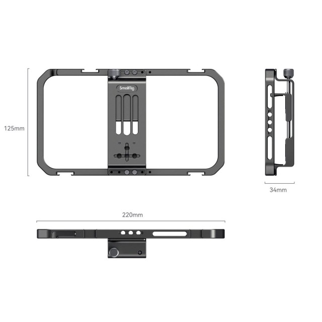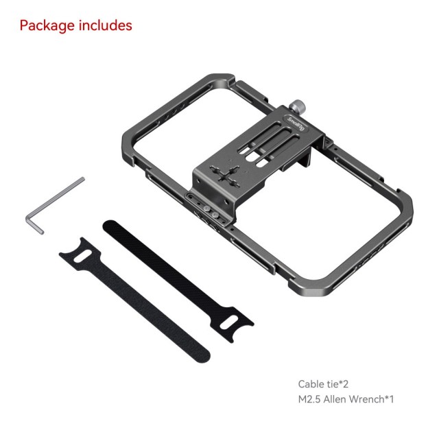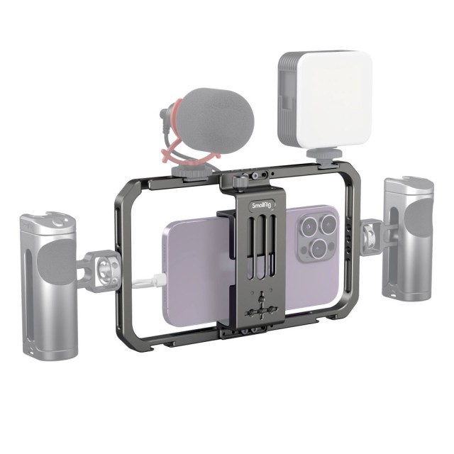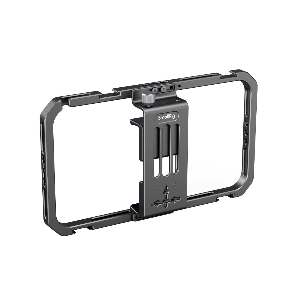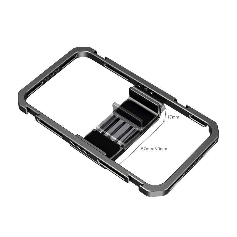 La jaula universal para teléfonos móviles SmallRig 2791 es ideal para vlogs, retransmisiones en directo y grabaciones con el móvil. Funciona a la perfección con la mayoría de los teléfonos móviles de las principales marcas del mercado y es compatible con teléfonos móviles de entre 67 mm y 86 mm de ancho, con o sin funda. En lugar de un sistema de sujeción a presión, cuenta con un sistema de fijación por tornillo que garantiza una sujeción más estable. Está equipada con dos soportes de montura fría para micrófono y luz LED. Varios orificios con rosca de 1/4" pueden utilizarse para fijar un trípode, como el SmallRig Aluminum Mini Tripod BUT2429, o un asa superior, como el SmallRig Mini Top Handle for Lightweight Cameras (1/4"-20 Screws) 2821, o de asas laterales, como la SmallRig Aluminum Side Handle for Smartphone Cage HSS2424.