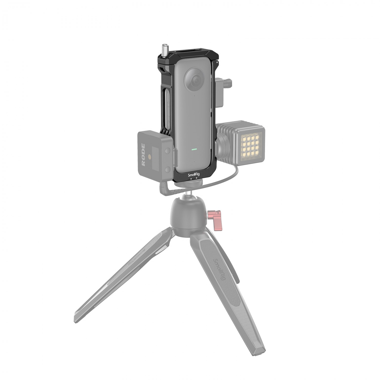 El ligero bastidor funcional de aluminio de SmallRig ofrece opciones de montaje de accesorios y protección para la cámara Insta360 ONE X2. La cámara se fija al bastidor desde arriba, se asegura de forma segura mediante un tornillo de fácil manejo con superficie estriada e incluye almohadillas blandas que protegen la cámara de arañazos. Permite un acceso total a los controles de la cámara y ofrece diversas opciones de montaje. Además de las patas de montaje integradas a cada lado para accesorios como micrófonos pequeños, el marco también está equipado con dedos de montaje y una rosca de 1/4"-20 para fijar la cámara a trípodes u otros soportes de tres patas. La tapa de silicona para el objetivo incluida en el paquete protege el objetivo de golpes y arañazos.
