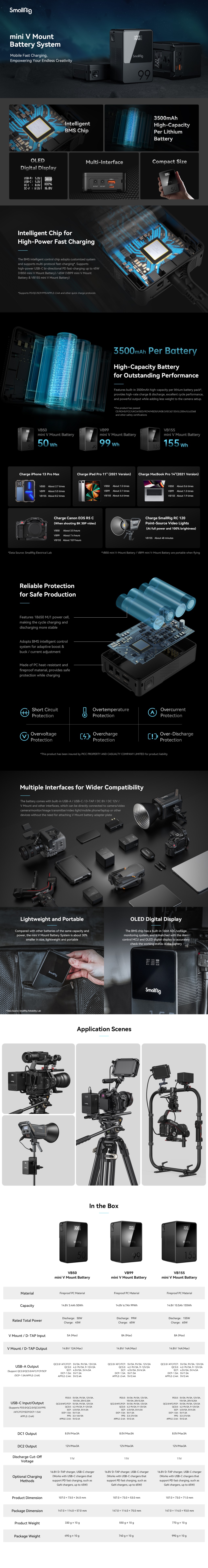 La VB155 es aproximadamente un 70 % más pequeña que una batería tipo V convencional gracias a su diseño altamente integrado, que ocupa menos espacio, por lo que es más ligera y fácil de transportar. El chip BMS altamente integrado (chip de protocolo de carga rápida + MCU + control de aumento de tensión) es compatible con una amplia gama de los principales protocolos de carga rápida (PD/QC/SCP/PPS/APPLE-2.4A, etc.), carga bidireccional de 65 W (máx.) Carga rápida USB-C PD, así como aumento adaptativo de tensión/regulación adaptativa de corriente, etc. Además, su BMS inteligente personalizado garantiza una carga más rápida y segura al proporcionar protección múltiple contra sobrecorriente/cortocircuito/sobrecalentamiento/sobretensión, etc. También incluye interfaces como USB-A / USB-C / D-tap / DC 8V / DC 12V / V-mount para una carga / alimentación eficiente de cámaras fotográficas / videocámaras / monitores / transmisores de vídeo inalámbricos / luces de vídeo / teléfonos móviles / ordenadores portátiles, etc., ¡sin necesidad de utilizar una placa V-mount para la conversión! El chip BMS está equipado con un algoritmo ADC de 16 bits y un medidor de consumo, junto con una MCU y una pantalla OLED digital que le informa constantemente del estado de la batería. La batería premium de alto rendimiento integrada (sin sobrecapacidad), recargable y estable, cumple con las normas MSDS/UN38.3/IEC62133/UL2054/UL62368 y otras normas internacionalmente reconocidas, lo que te permitirá capturar cada momento sin esfuerzo.
