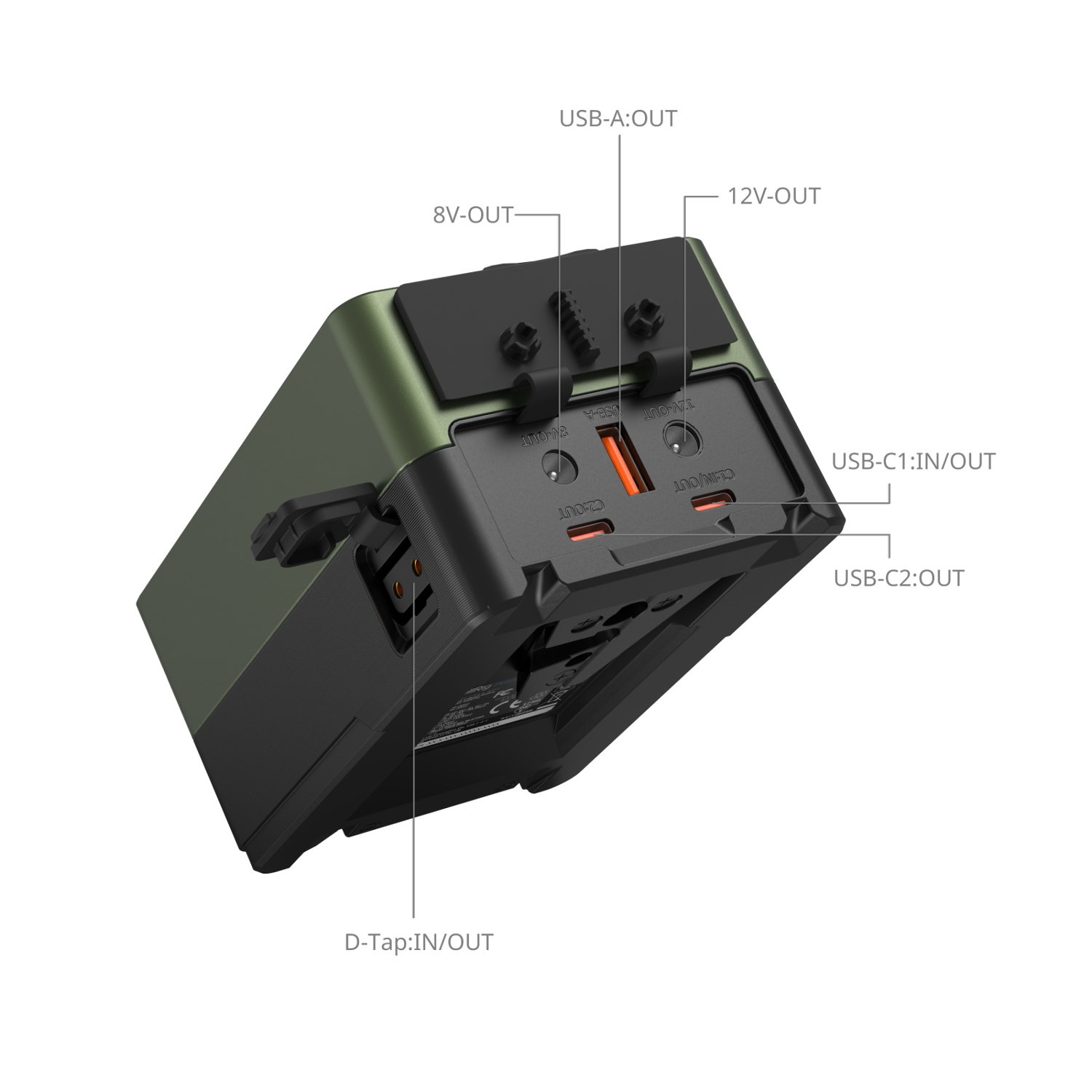 4. Interfaces: 2 USB-C, 1 D-Tap, 1 USB-A, 1 salida de 8 V, 1 salida de 12 V, cada una con diseño en paralelo que permite la carga rápida simultánea por USB-C y USB-A.