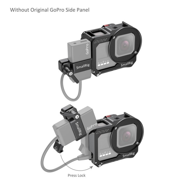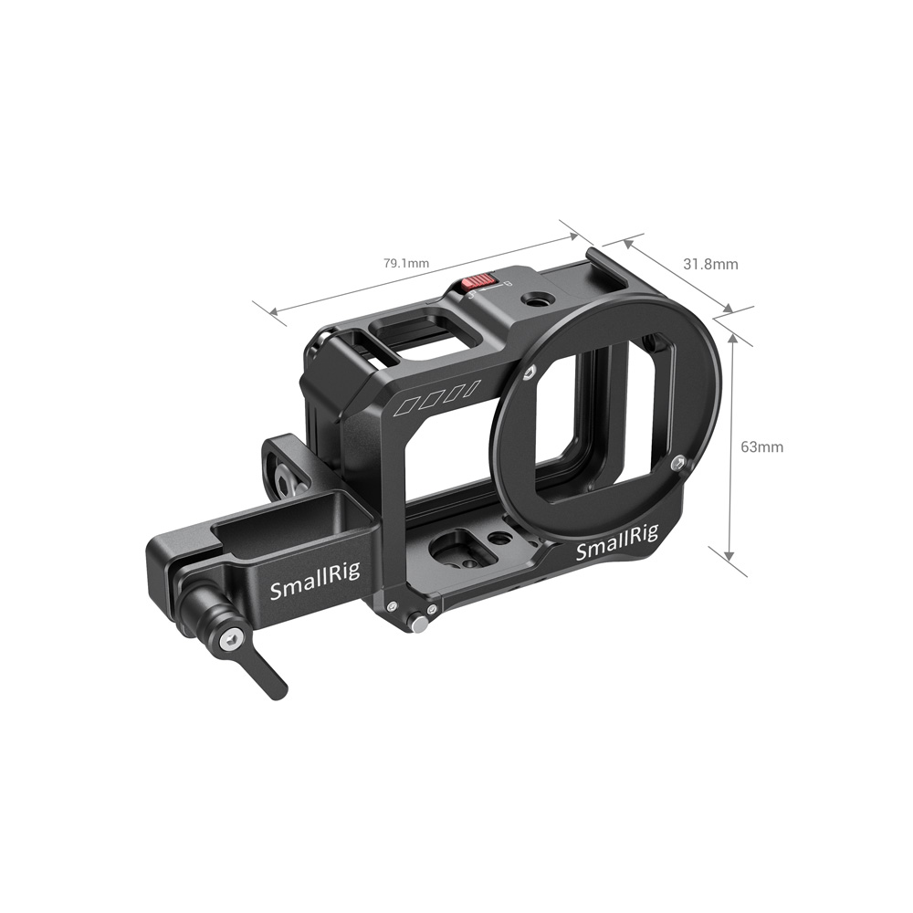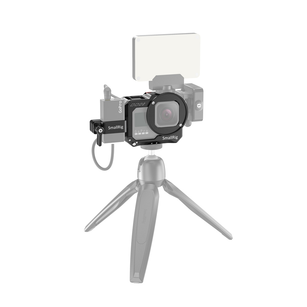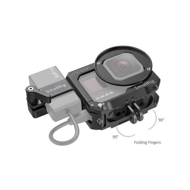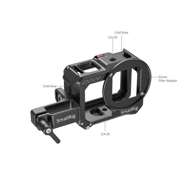 La jaula está equipada con dos zapatas frías y varios orificios de 1/4"-20 para montar accesorios, como un micrófono, una pequeña luz LED, el soporte SmallRig Cold Shoe Mount 1593 o la zapata fría 1960. El soporte para el adaptador de micrófono GoPro se fija al lado derecho de la carcasa mediante los dos tornillos de 1/4"-20 incluidos. Las garras abatibles de la parte inferior permiten fijar la cámara a diversos soportes y superficies GoPro, mientras que el soporte de 1/4"-20 del centro permite fijar la cámara a un trípode de 1/4"-20. El panel lateral es de apertura rápida para cambiar las baterías y puedes cargar la cámara a través del puerto USB-C sin necesidad de abrir el panel. En la parte delantera de la carcasa hay una rosca para filtros que admite filtros con rosca de 52 mm.