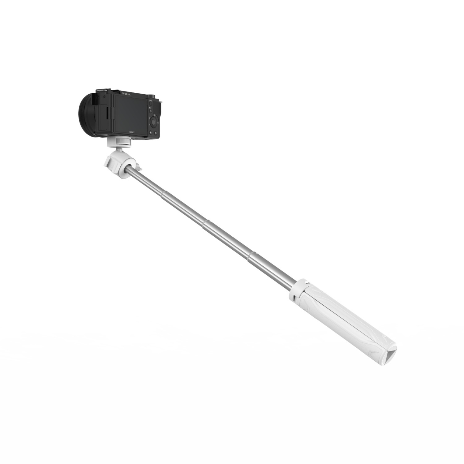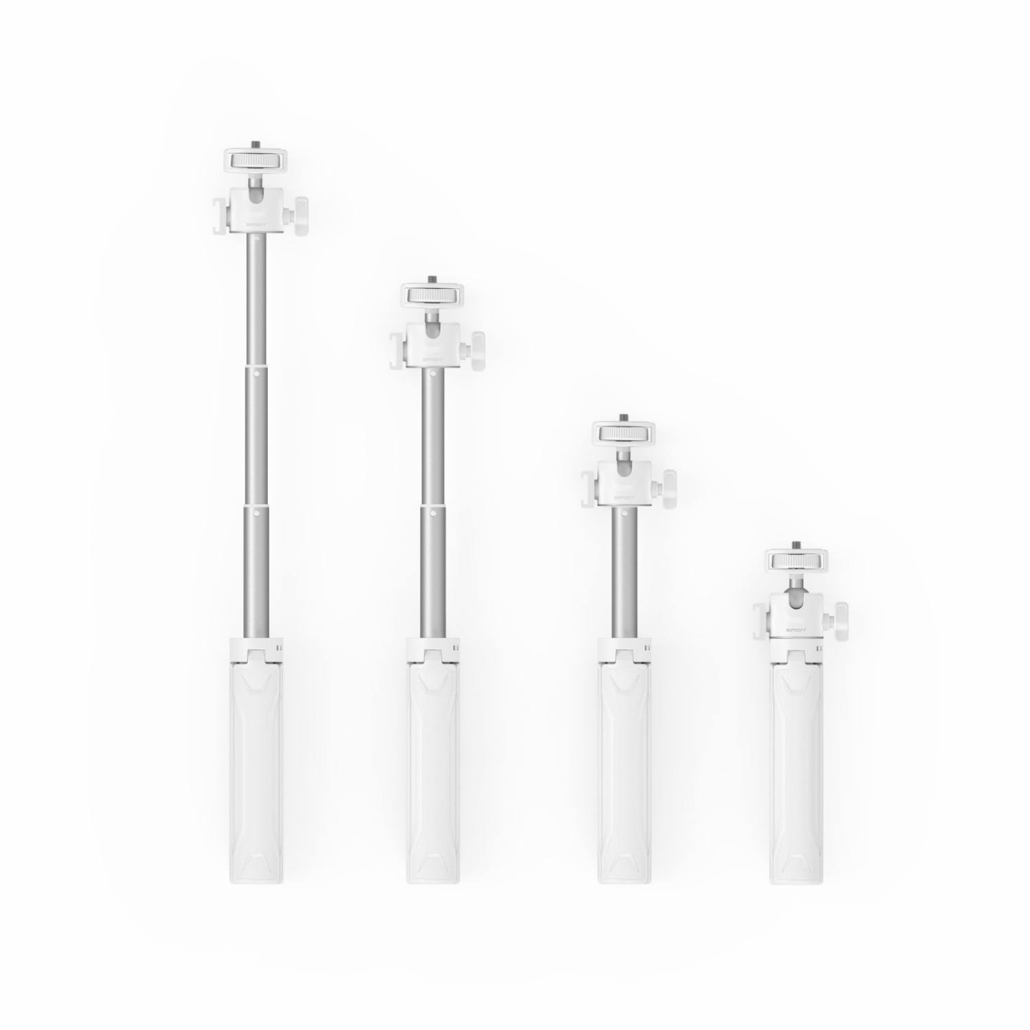 SmallRig VT-15 White Vlog Tripod 3825B. Estos productos están fabricados con nailon + 30 % de fibras, aleación de aluminio y otros materiales; son compactos y portátiles, a la vez que estables y con gran capacidad de carga. El trípode está equipado con un soporte giratorio de zapata fría que permite ampliar el equipo de grabación, como luces LED y micrófonos; la parte superior utiliza un tornillo de 1/4 para la fijación, lo que lo hace ampliamente compatible con teléfonos móviles, cámaras réflex compactas, cámaras de acción y otros equipos. La rótula de 360° del cardán permite ajustar libremente diversos ángulos y, al mismo tiempo, cambiar rápidamente entre la orientación horizontal y vertical. El producto tiene un tamaño de almacenamiento de 21,5 cm, un tamaño máximo extendido de 48,5 cm y puede soportar con seguridad un peso de 1,5 kg.