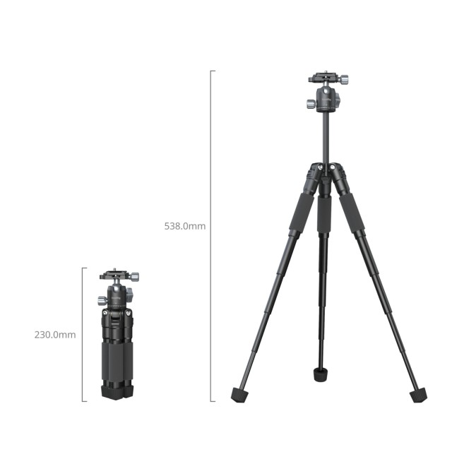 Gracias a la columna central ajustable verticalmente, el trípode se puede extender hasta una altura de trabajo de 53,8 cm, lo que permite diversos ángulos de toma. Plegado, mide 23 cm y pesa 620 g, lo que lo convierte en un producto compacto y ligero fácil de transportar. Las resistentes patas de aleación de aluminio soportan una carga de 5 kg (3 kg para el cabezal).
