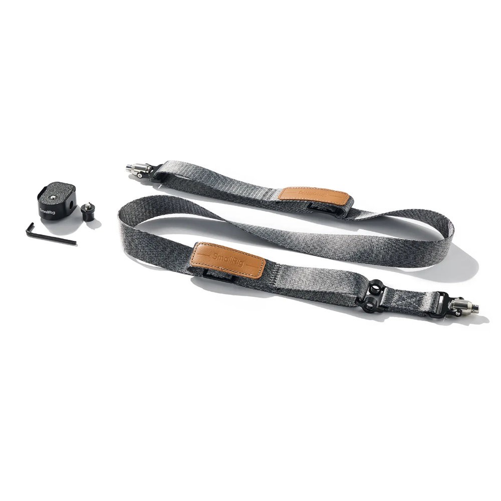 La correa de hombro SmallRig para reducir el peso para DJI RS 4 / RS 4 Pro / RS 3 / RS 3 Pro / RS 2 4118B funciona con un mango para montura, como el 3028B, 3028C, el asa de suspensión DJI o cualquier otra con un orificio roscado de 1/4-20" en la parte superior, lo que permite una filmación más cómoda. Fija la placa base a la parte inferior del gimbal DJI con un tornillo de 1/4-20", cuelga la correa para el hombro sobre el hombro derecho y extiende el trípode. Al grabar, basta con levantar el gimbal; en tomas estáticas, puede liberarte de casi toda la tensión en los brazos. Cuando no estés grabando, basta con soltar el gimbal y colgarlo en la parte delantera o en el costado como una bandolera, lo que reducirá la carga en los brazos. En ambos extremos de la correa para el hombro hay dos enganches giratorios QD que soportan un peso de hasta 30 kg y ofrecen más opciones de sujeción. Dos hebillas deslizantes permiten ajustar fácilmente la longitud. Además, los orificios roscados de 1/4-20" y 3/8-16" en la placa base permiten fijar trípodes u otros dispositivos.