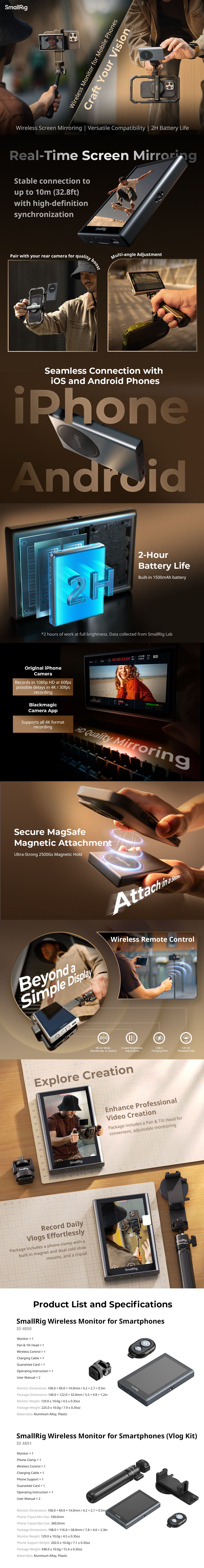 El monitor de vídeo inalámbrico para móvil (kit para vlog) 4851B de SmallRig ofrece una solución de duplicación de pantalla para la creación de contenido móvil. El producto incluye un monitor para teléfono móvil, un soporte para el teléfono, un mando a distancia inalámbrico, un cable de carga y otros accesorios. El monitor se puede acoplar al teléfono mediante el soporte incluido y otros accesorios adaptadores, o bien se puede fijar magnéticamente a iPhones o teléfonos con anillos magnéticos, lo que ofrece una gran versatilidad. Al tomar selfies o utilizar la cámara trasera del teléfono, el monitor puede mostrar en tiempo real una imagen especular de la vista de la cámara del teléfono móvil.